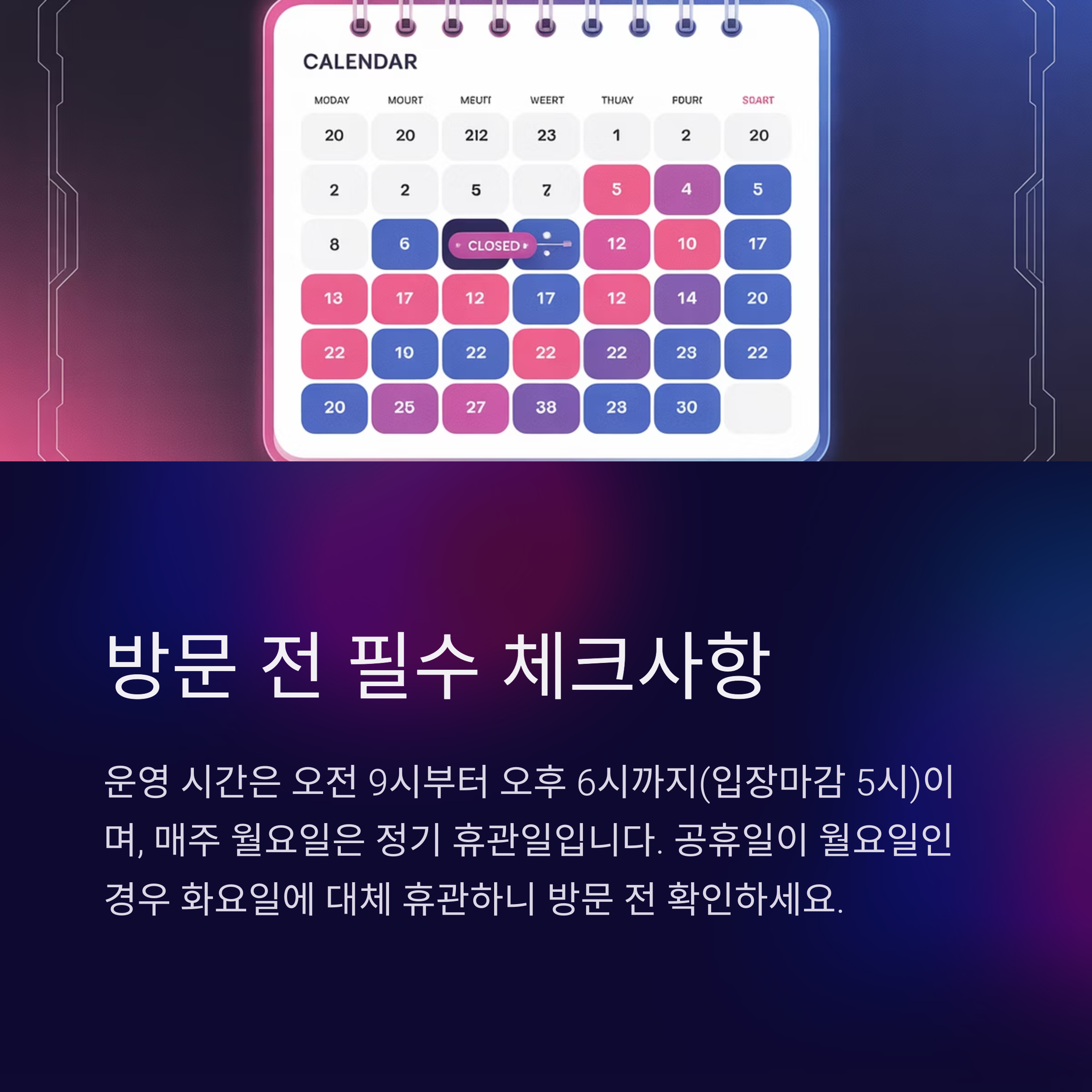 | 휴관일 | 매주 월요일 | 공휴일 포함 시 화요일 대체 휴관 |
