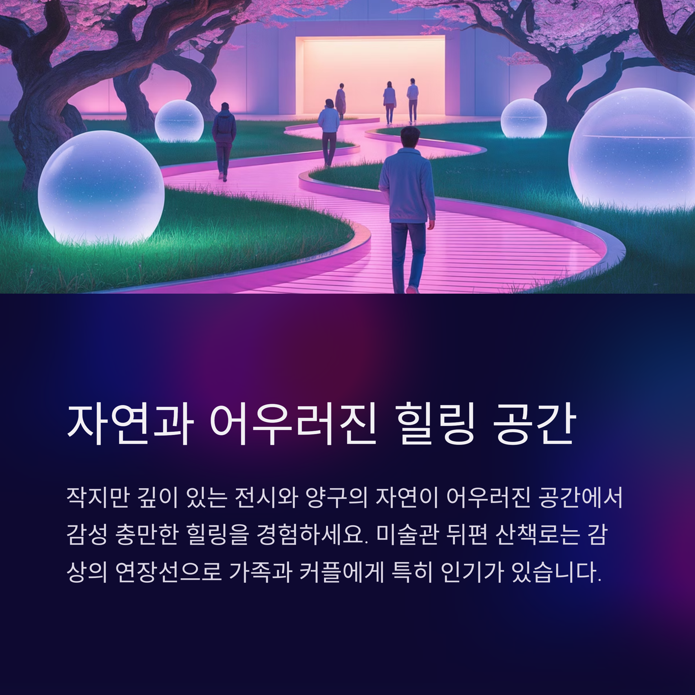 미술관 뒤편 산책로와 조형물 설치 공간도 감상의 연장선으로 여겨지며, 감성 충만한 힐링 코스로 손꼽힙니다.