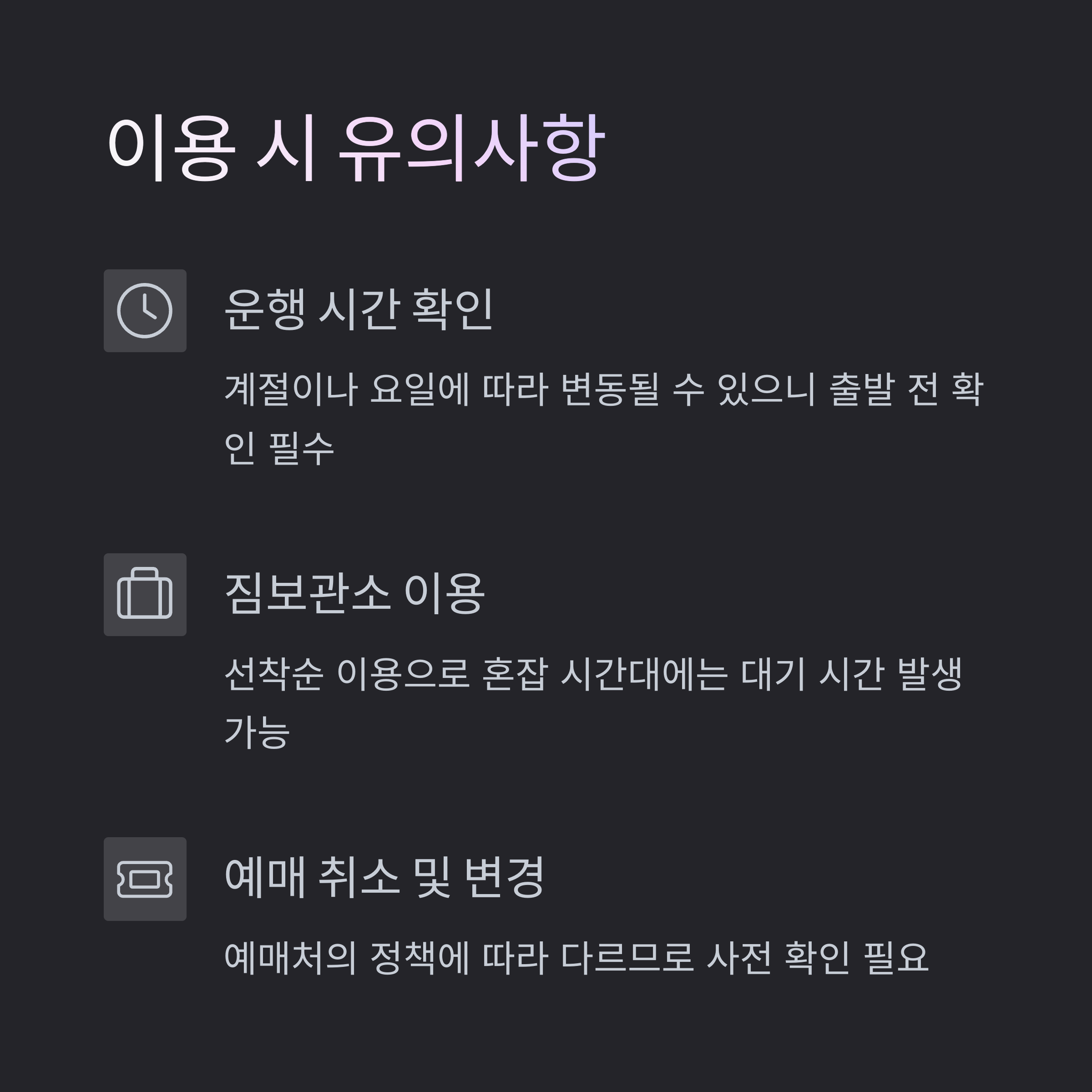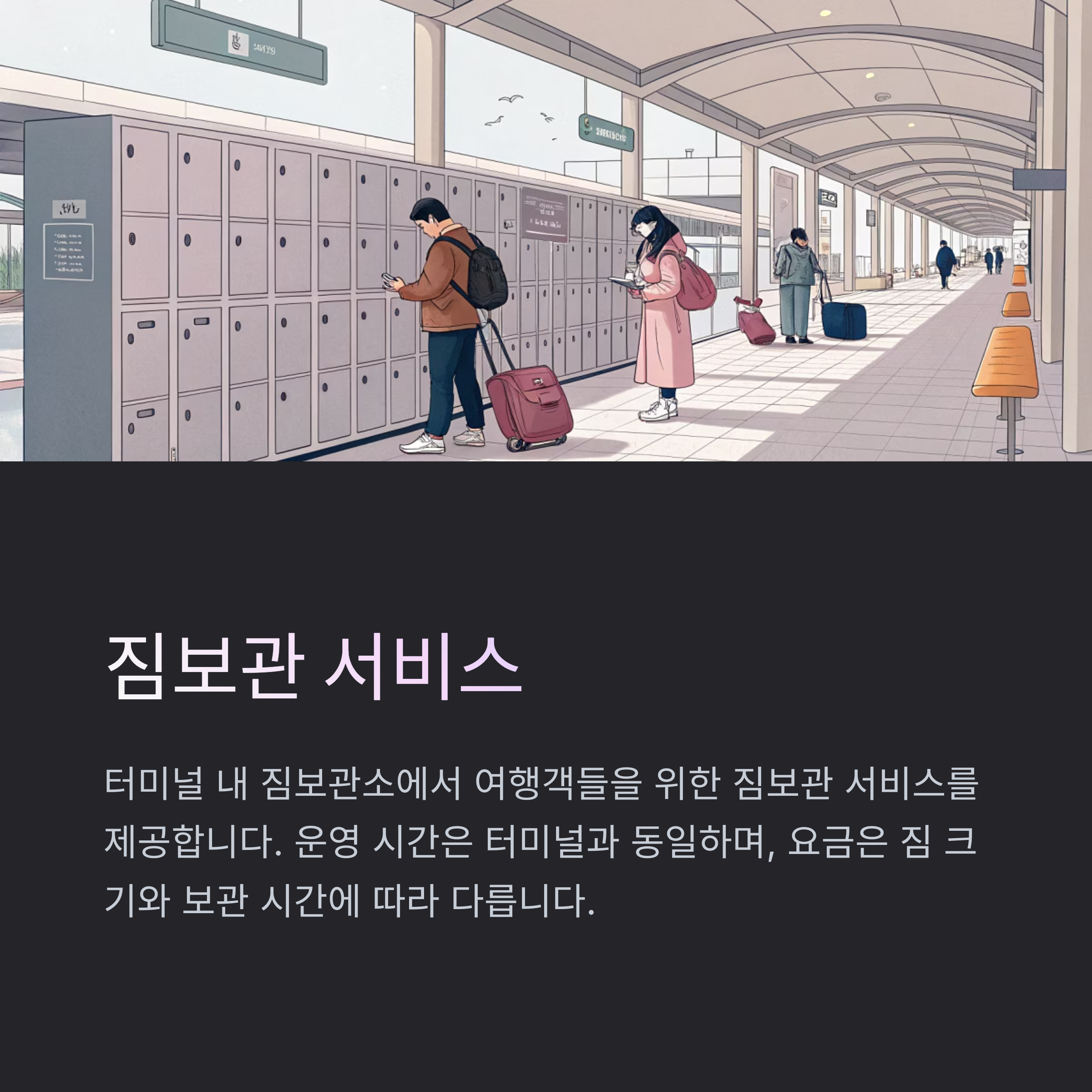 - 짐보관소 이용 시 주의사항: 귀중품은 보관소에 맡기지 마시고, 개인 소지품으로 관리하시기 바랍니다.