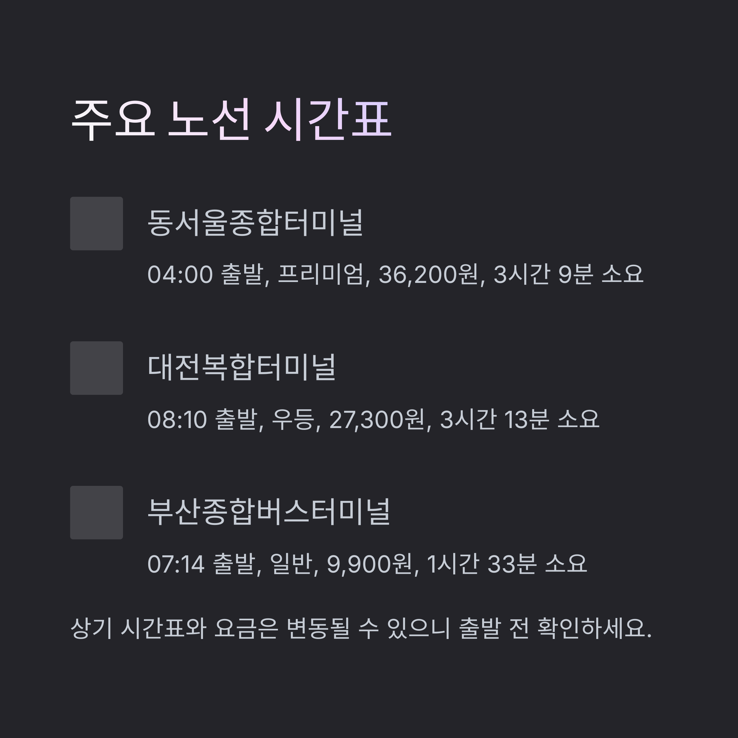 주요 노선 시간표 및 요금 안내