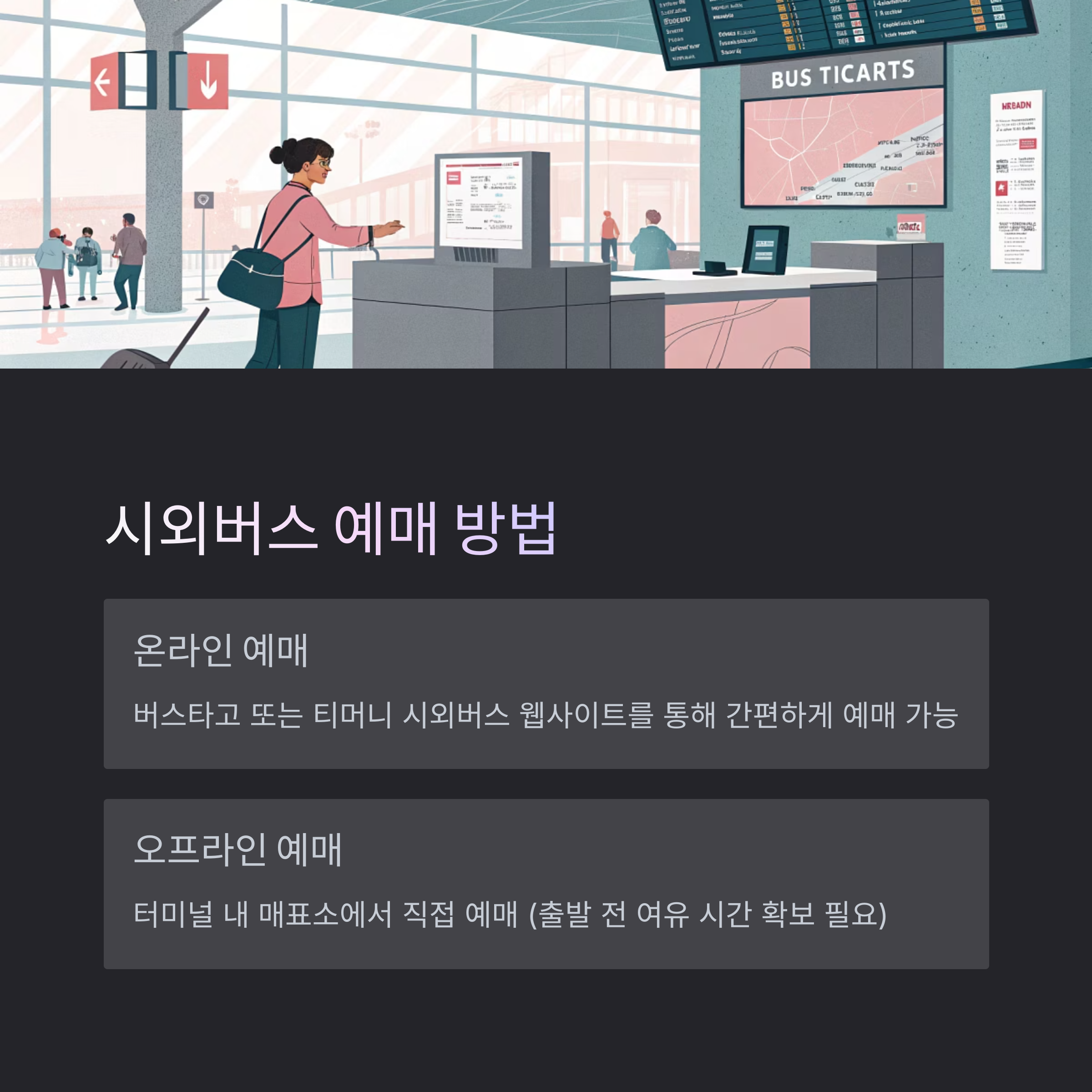 - 오프라인 예매: 터미널 내 매표소에서 직접 예매하실 수 있습니다. 출발 시간 전에 여유를 두고 방문하시기 바랍니다.