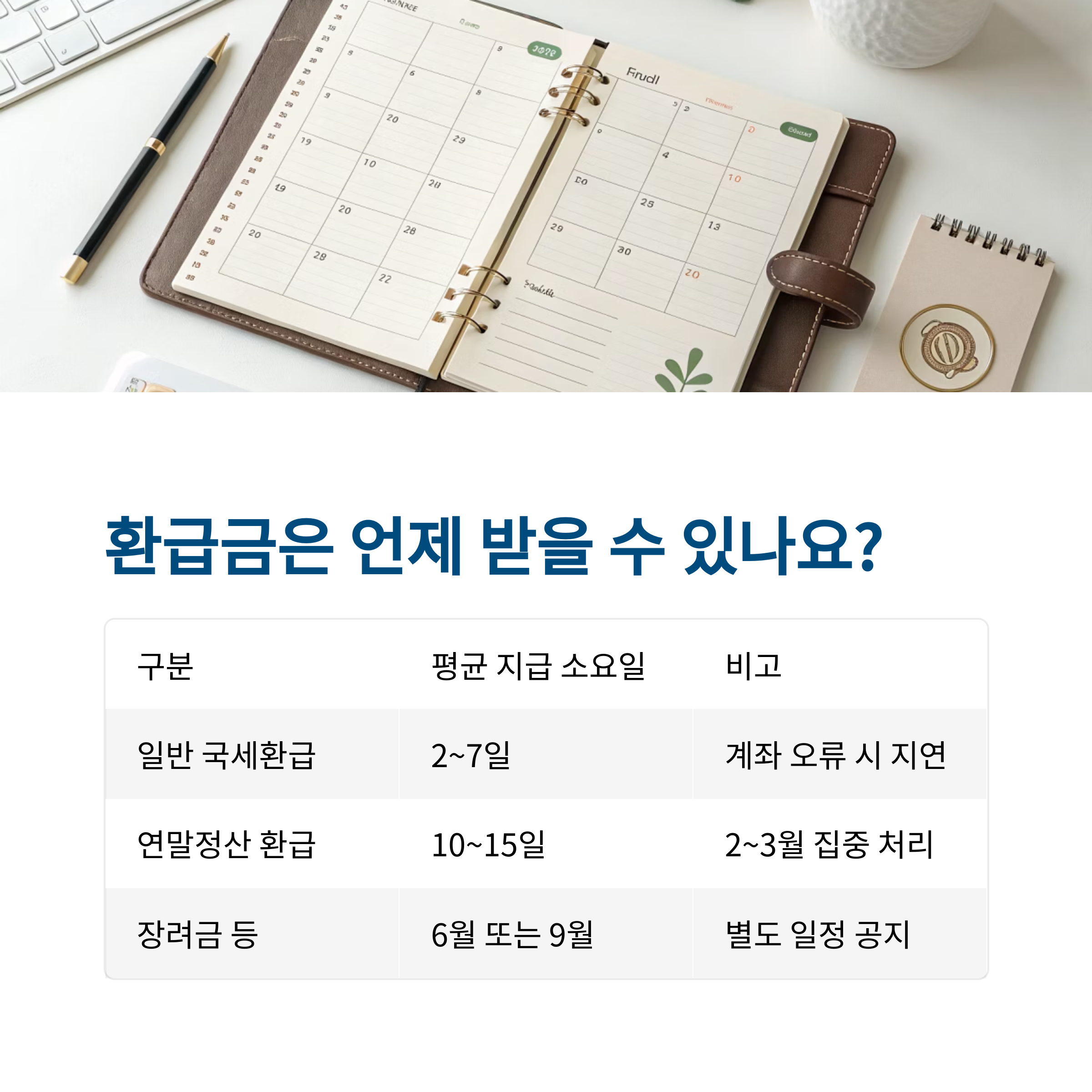 | 일반 국세환급 | 2~7일 | 신청 계좌 오류 시 지연 가능 |