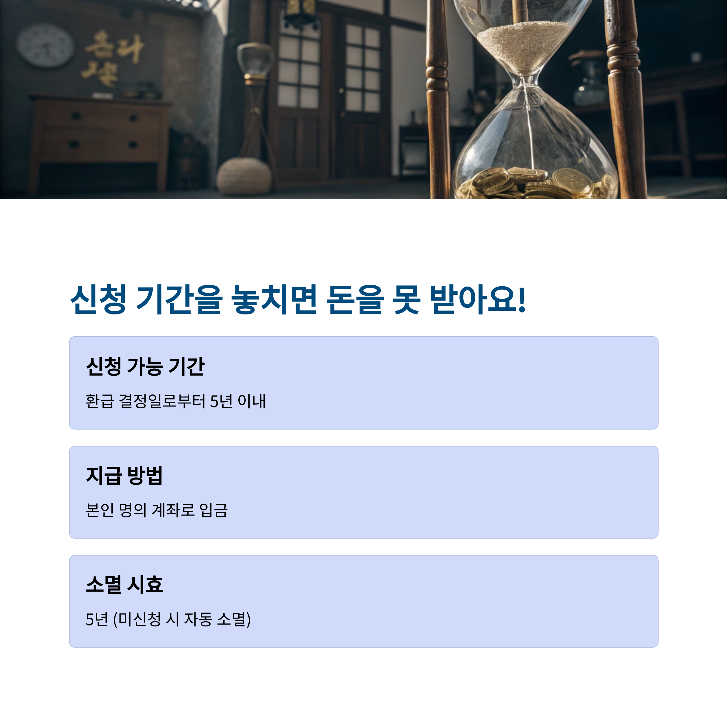 | 소멸 시효 | 5년 (지급일 기준, 미신청 시 자동 소멸) |