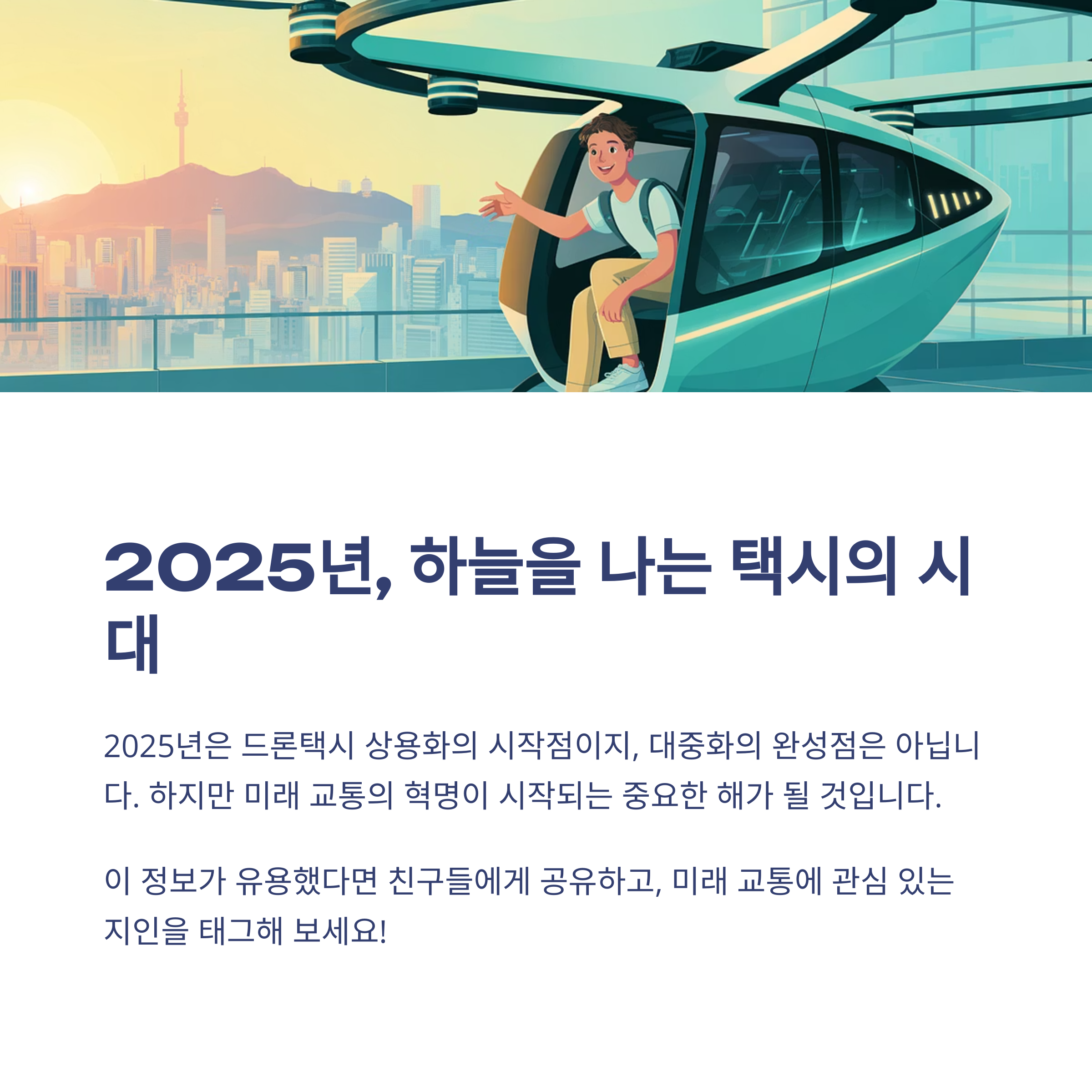 드론택시는 단순한 이동수단이 아니라 새로운 도시 생태계의 핵심 기술로 자리매김할 수 있습니다.