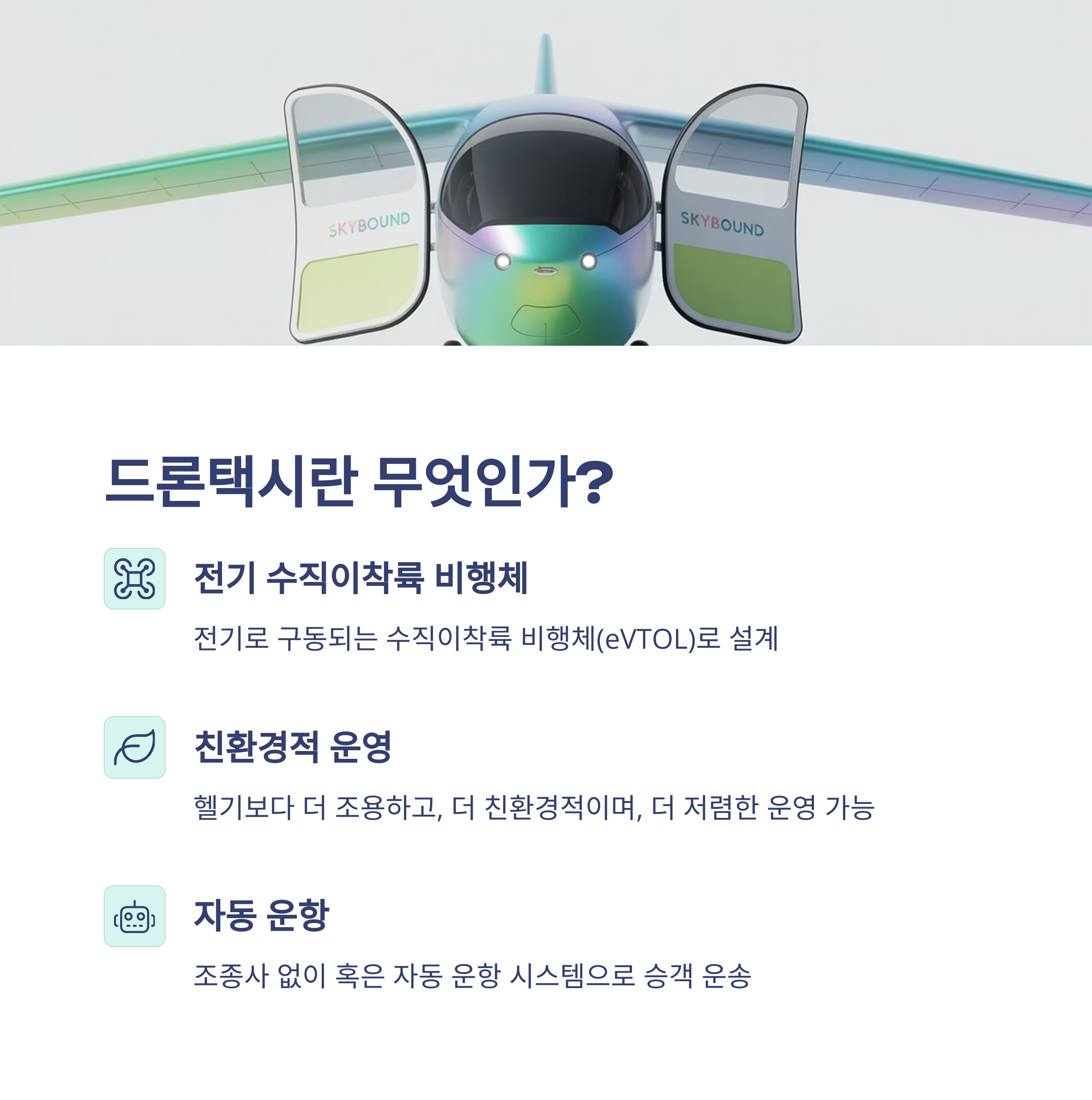 드론택시는 **전기로 구동되는 수직이착륙 비행체(eVTOL)**로,