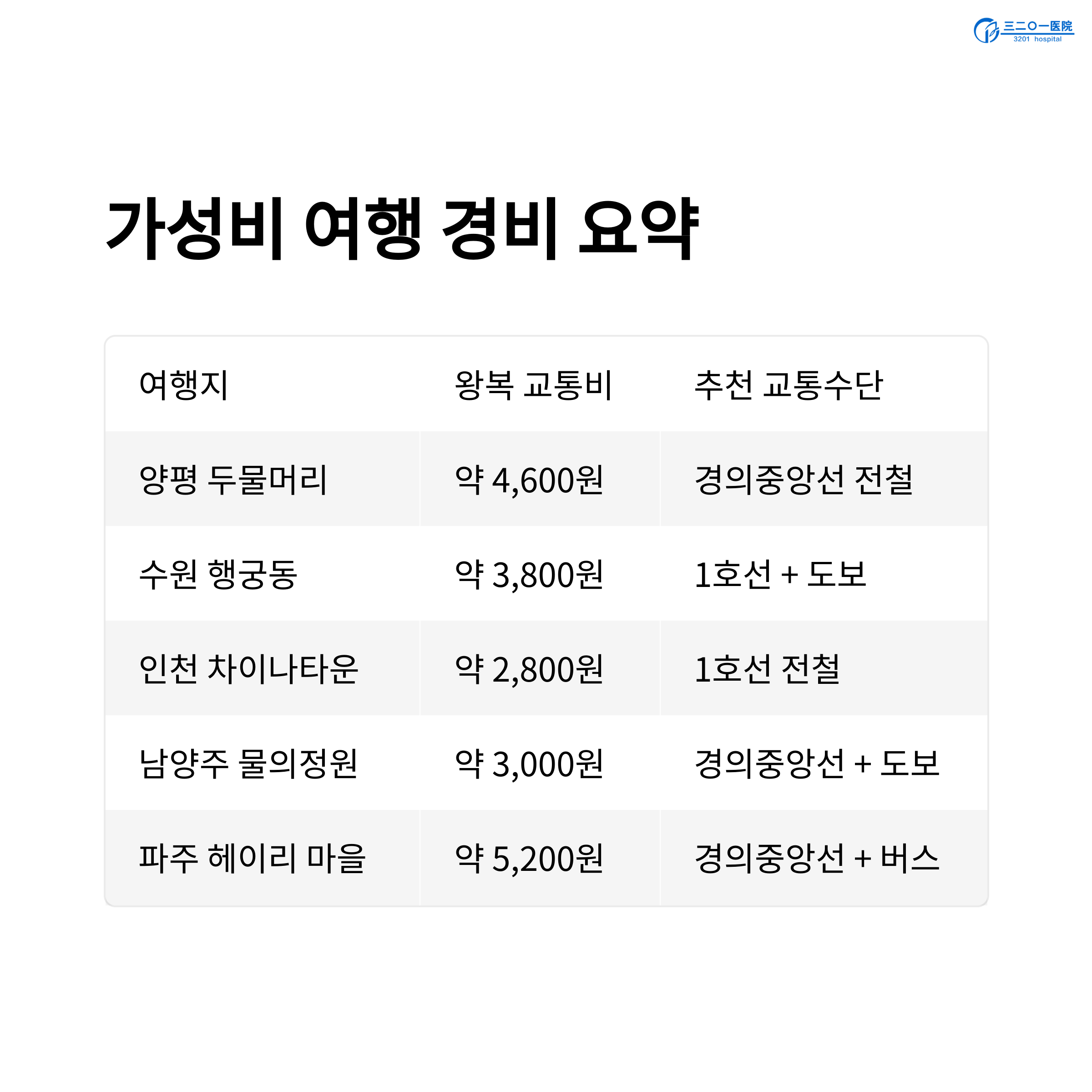왕복 교통비 4,600원(청량리 기준, ITX 제외)으로 가성비 최고입니다.