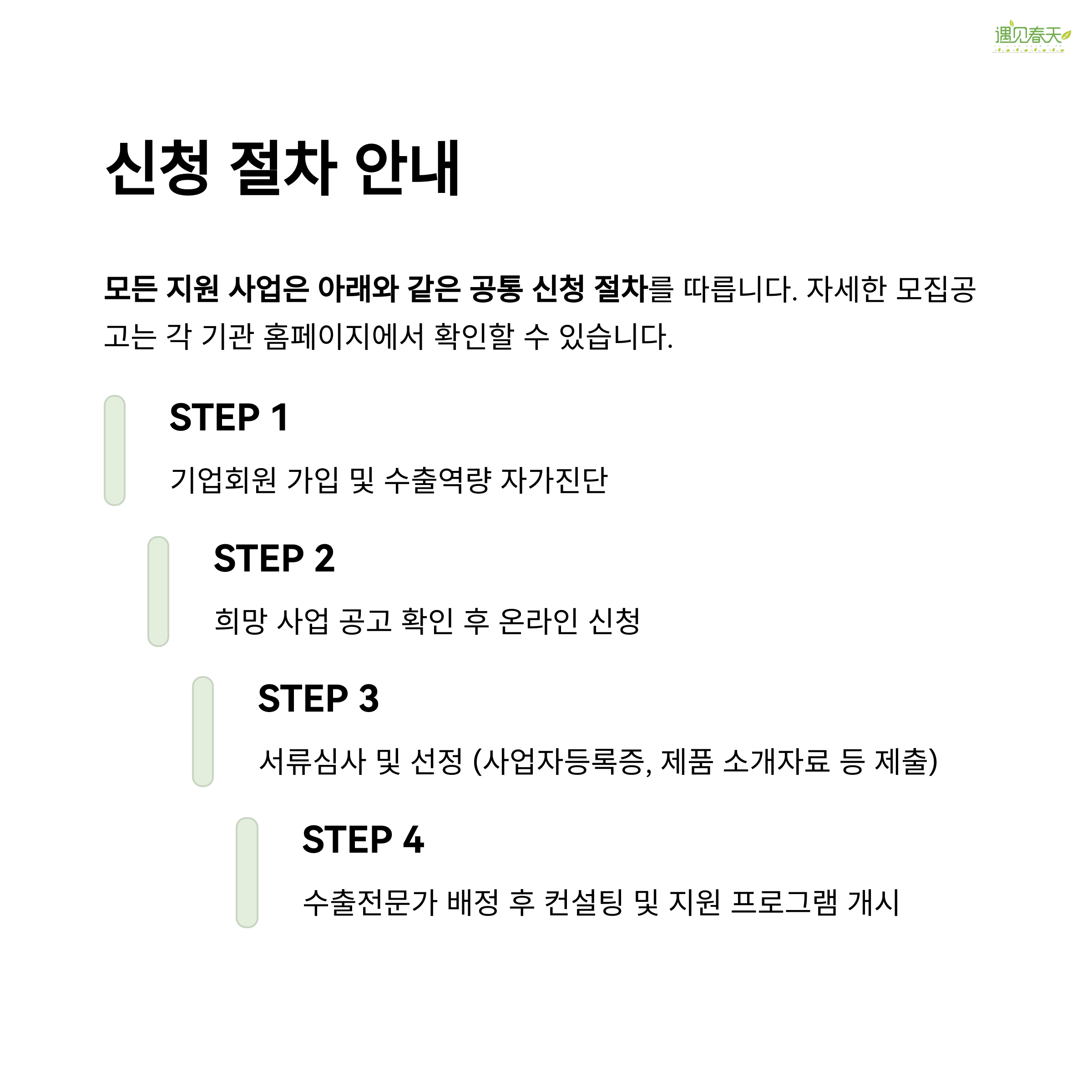 모든 지원 사업은 아래와 같은 공통 신청 절차를 따릅니다.
