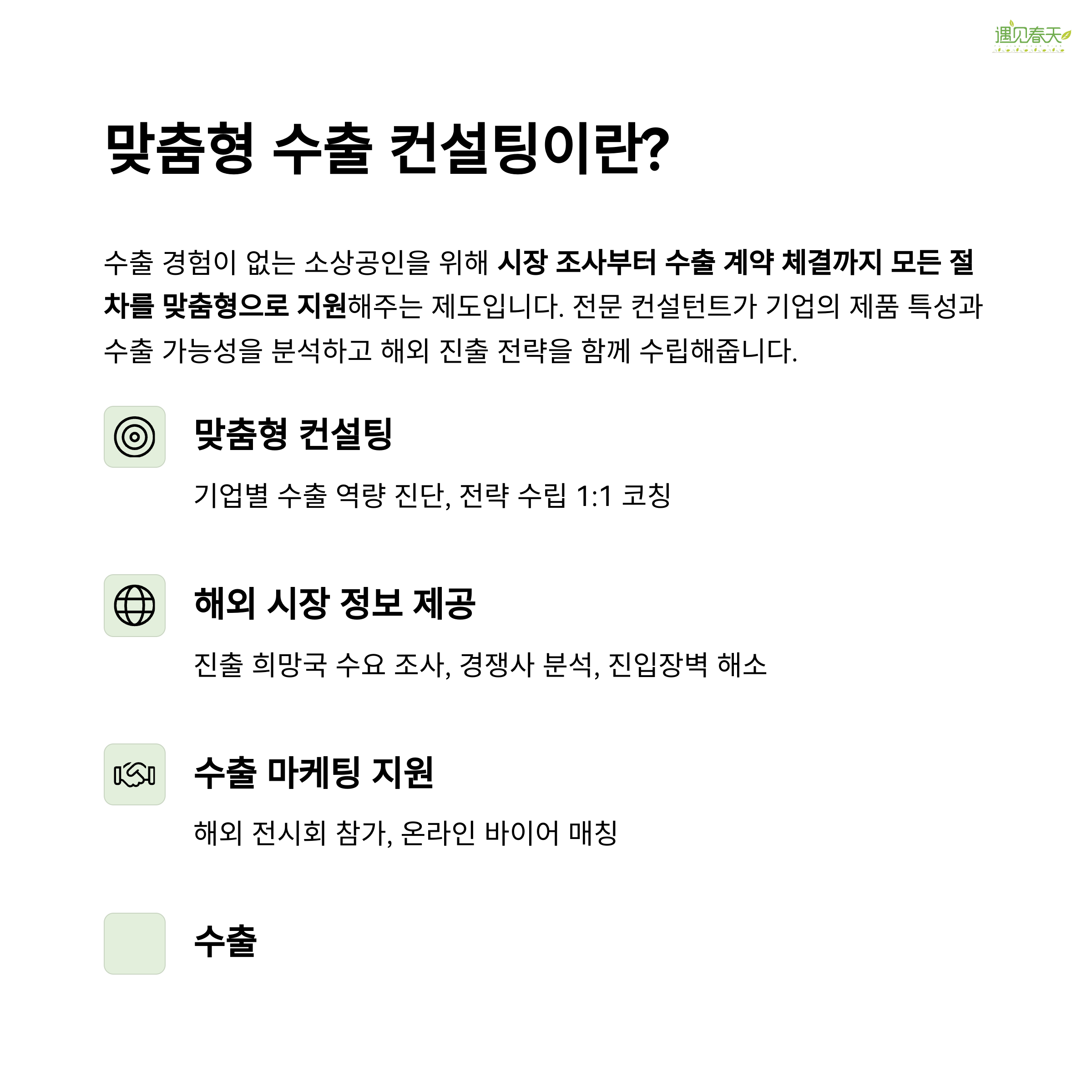 | 맞춤형 컨설팅 | 기업별 수출 역량 진단, 전략 수립 1:1 코칭 |