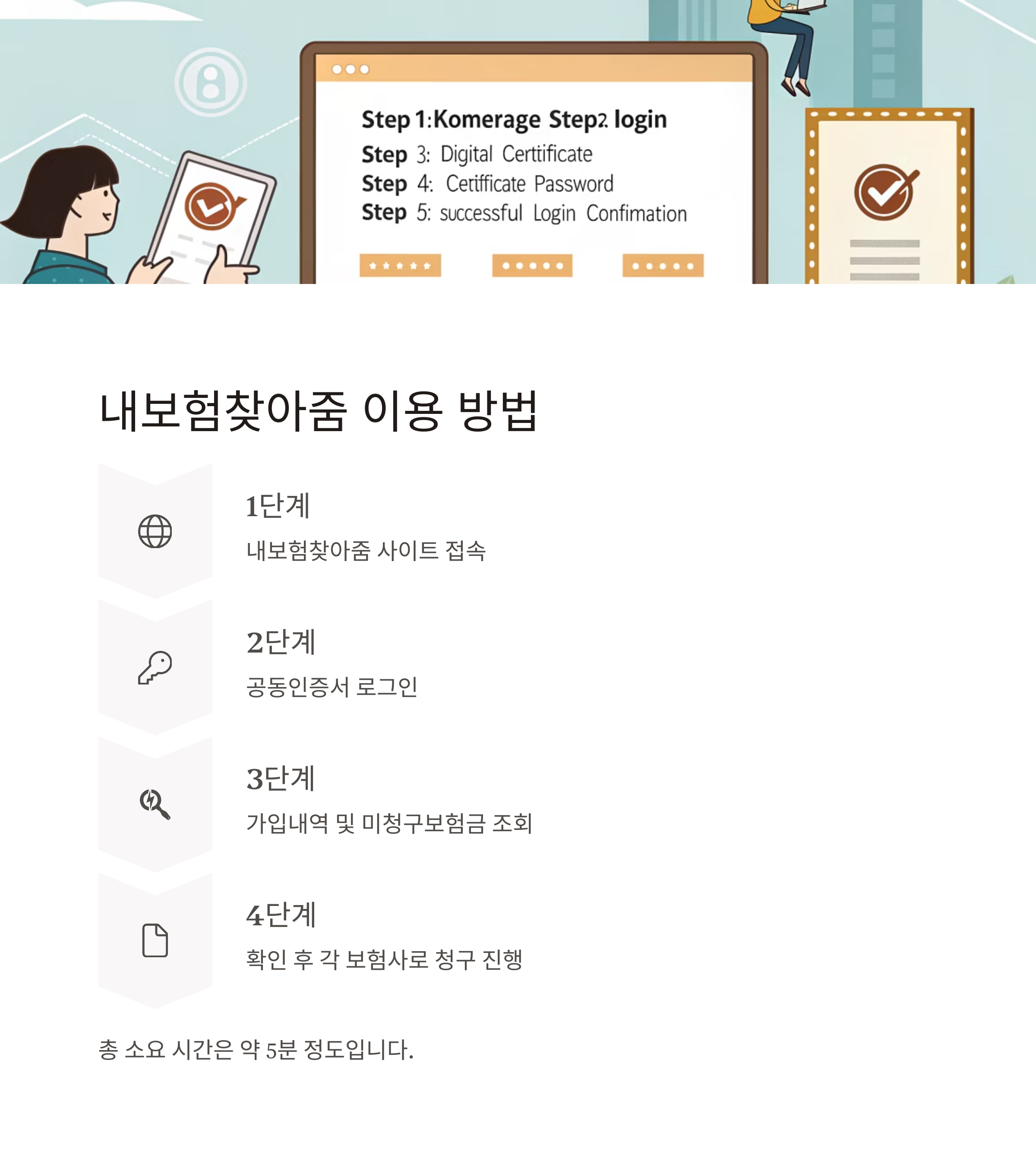 "내보험찾아줌"은 공인인증서(또는 공동인증서)만 있으면 5분 내 확인 가능합니다.