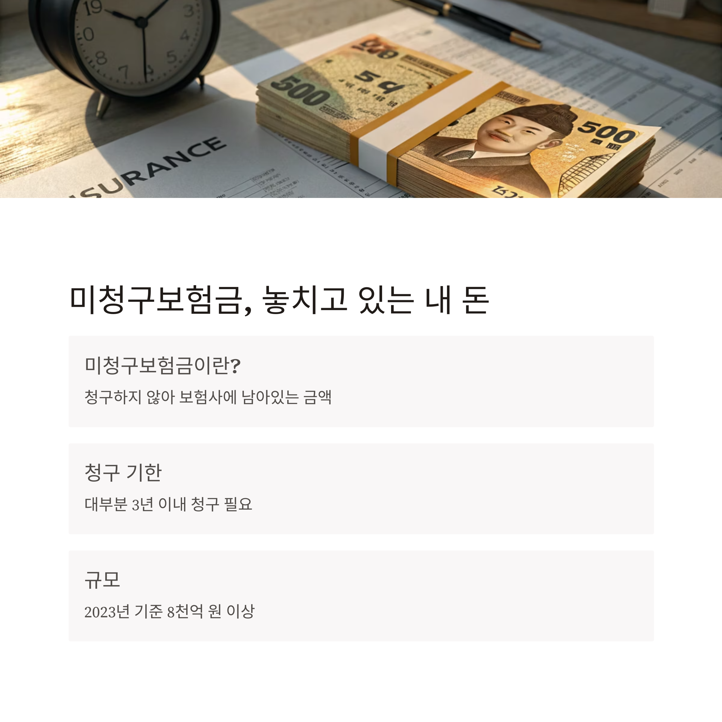 **"2023년 기준 미청구보험금은 8천억 원 이상"**이었으며, 대부분 개인이 몰라서 발생한 금액입니다.