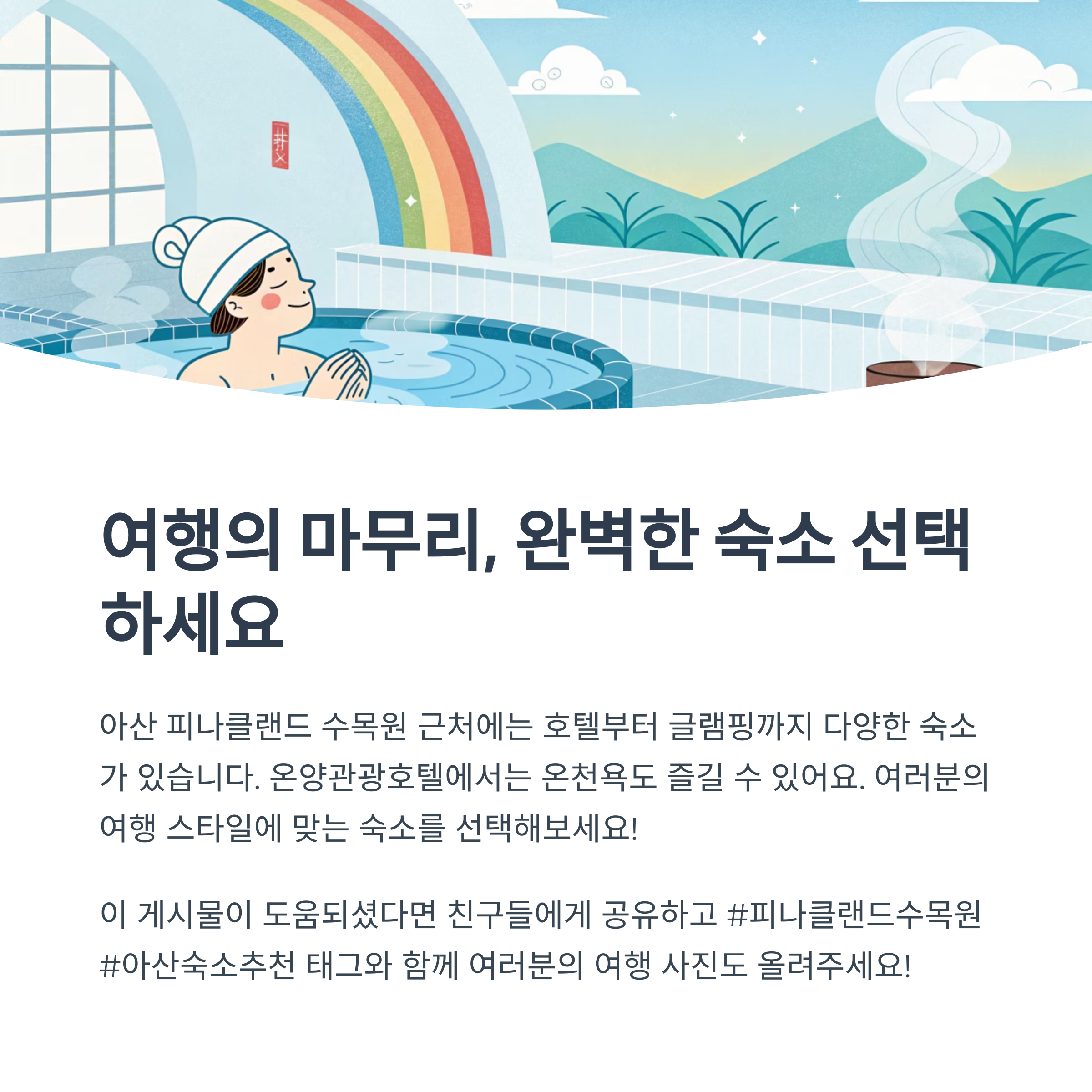 아산 피나클랜드 수목원은 사계절 내내 아름다운 꽃과 풍경으로 많은 이들의 사랑을 받는 명소입니다. 이곳을 방문하실 계획이라면, 주변에 위치한 편안하고 개성 있는 숙소에서의 하룻밤은 여행의 만족도를 더욱 높여줄 것입니다. 아래에 피나클랜드 수목원 근처의 다양한 숙소들을 소개해드리겠습니다.
