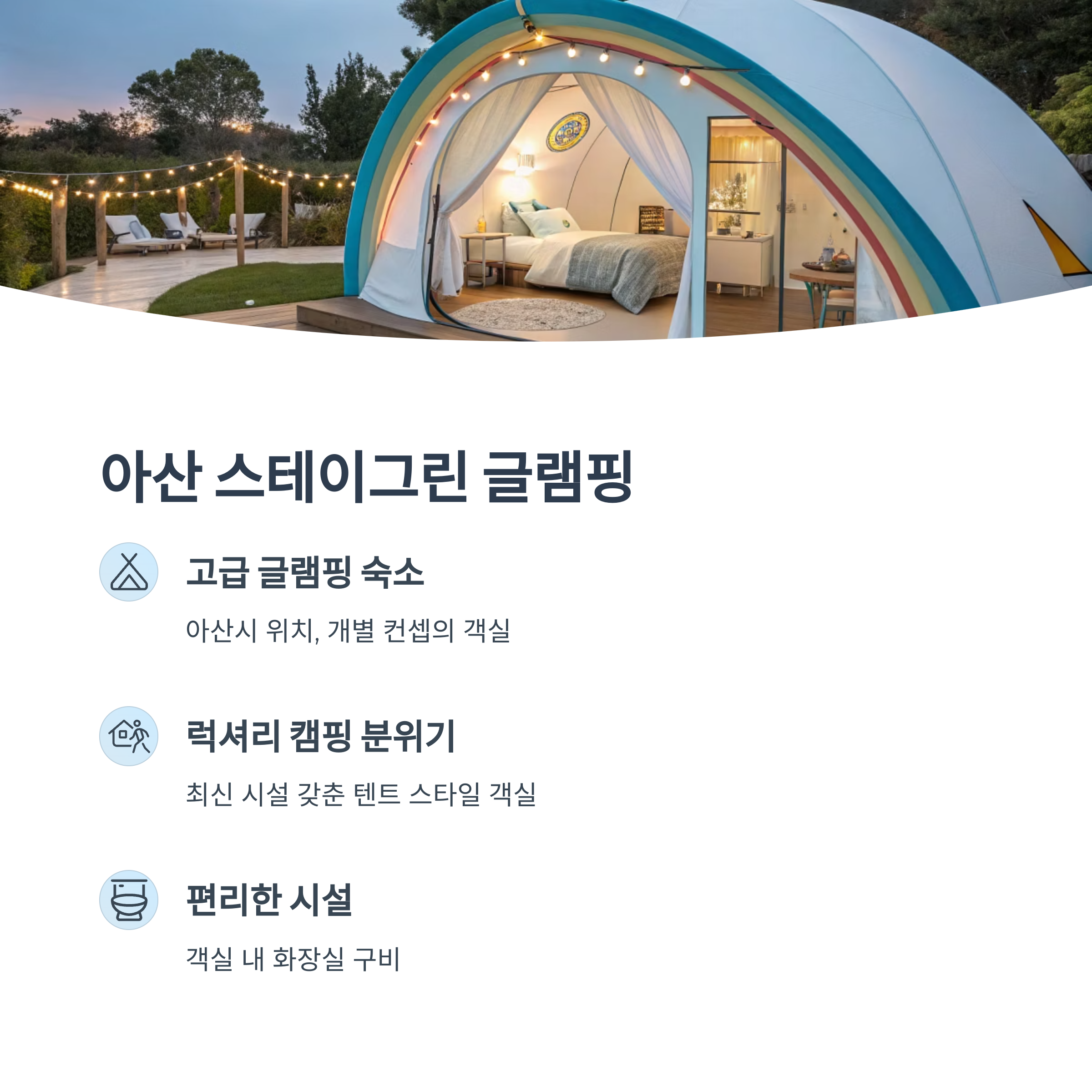 아산시에 위치한 고급 글램핑 숙소로, 각각의 객실이 개별적인 컨셉을 가지고 있습니다. 럭셔리한 캠핑 분위기를 즐길 수 있도록 최신 시설을 갖춘 텐트 스타일의 객실이며, 객실 안에 화장실도 있어 편리합니다.(호텔, 항공권, 렌트카, 투어&티켓 예약은 트립닷컴 | Trip.com)