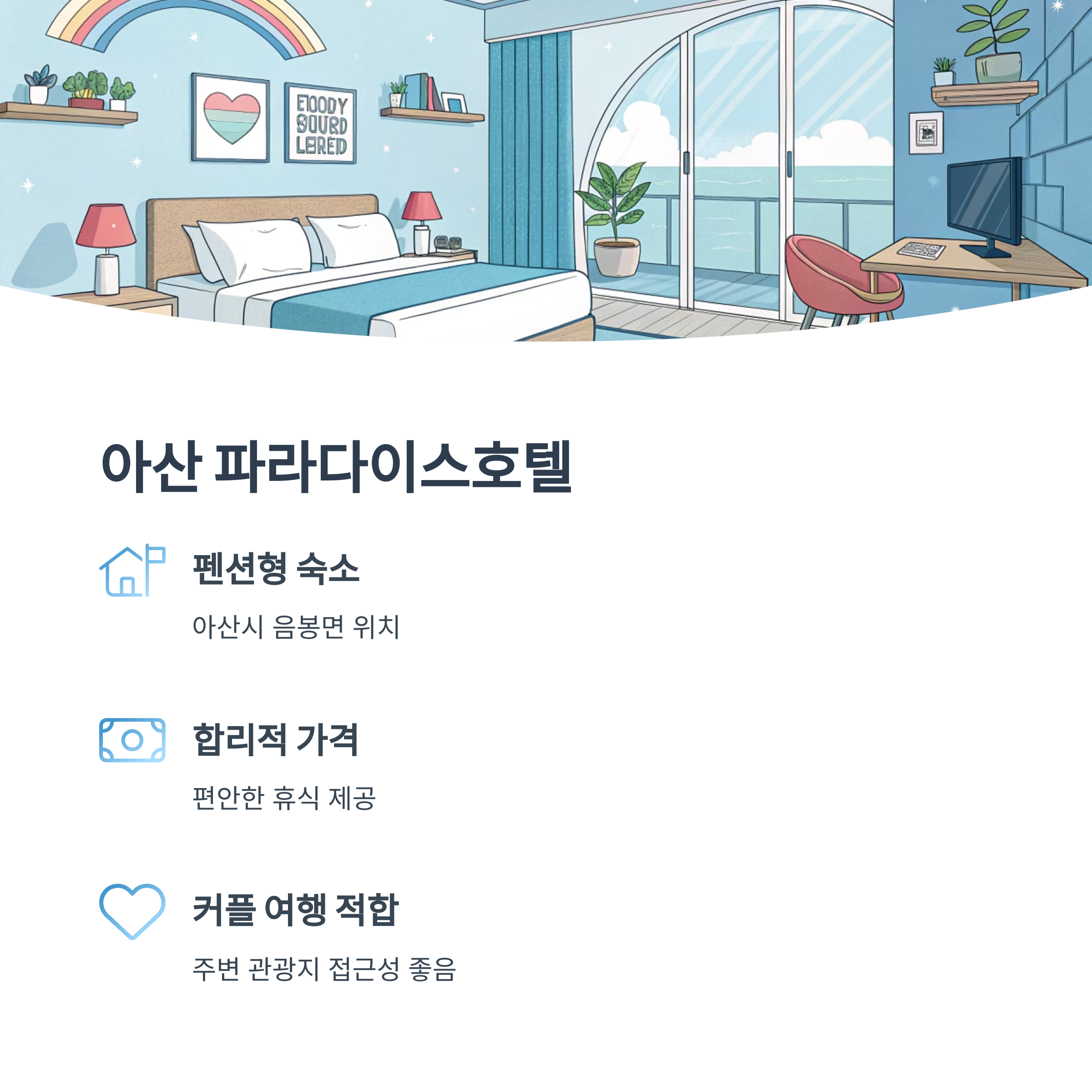 아산시 음봉면에 위치한 펜션형 숙소로, 합리적인 가격에 편안한 휴식을 취할 수 있습니다. 커플 여행객에게 적합하며, 주변에 다양한 관광지가 있어 접근성이 좋습니다.(WAUG)
