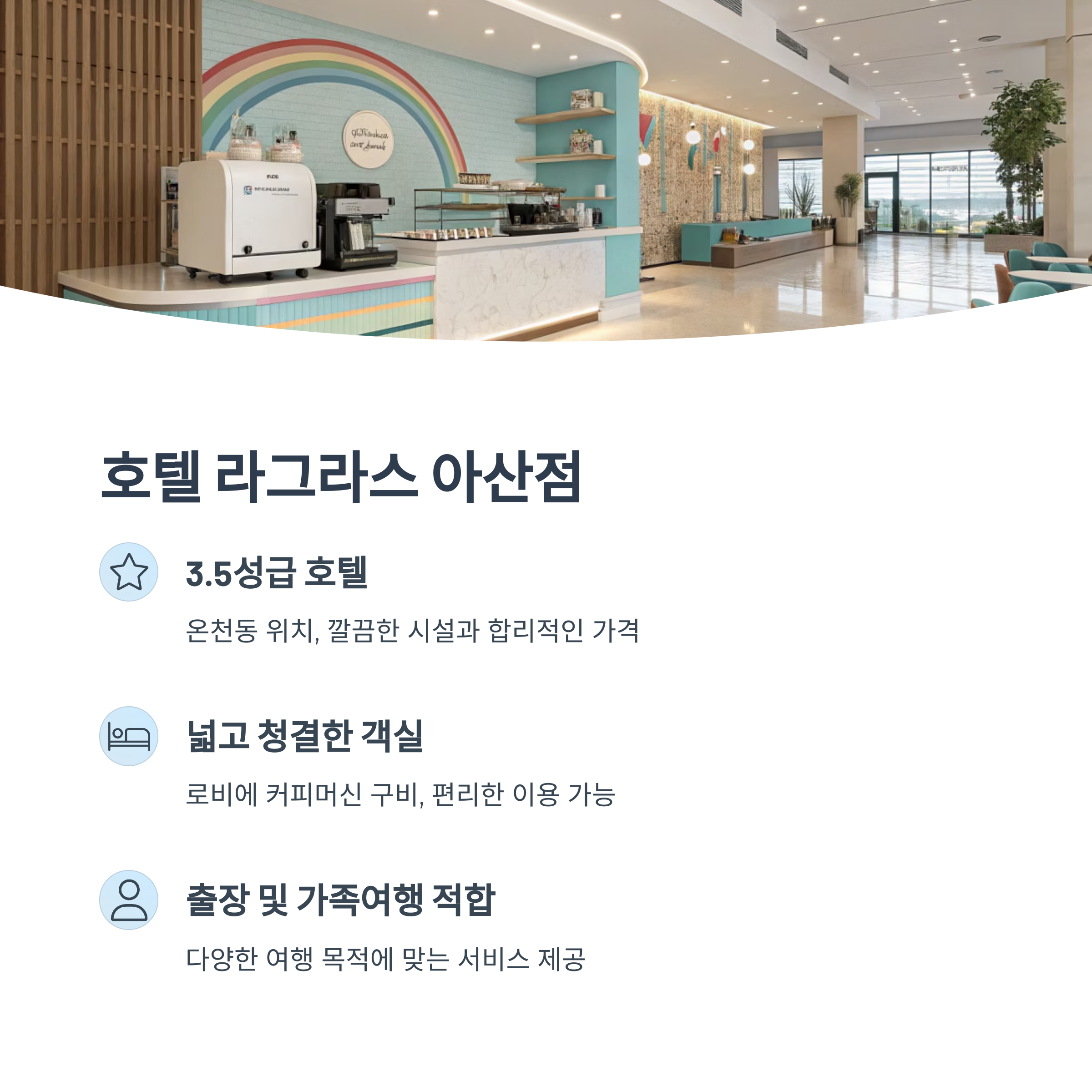 아산시 온천동에 위치한 3성급 호텔로, 온천욕을 즐길 수 있는 시설이 마련되어 있습니다. 합리적인 가격과 편리한 위치로 많은 여행객들에게 사랑받고 있습니다.