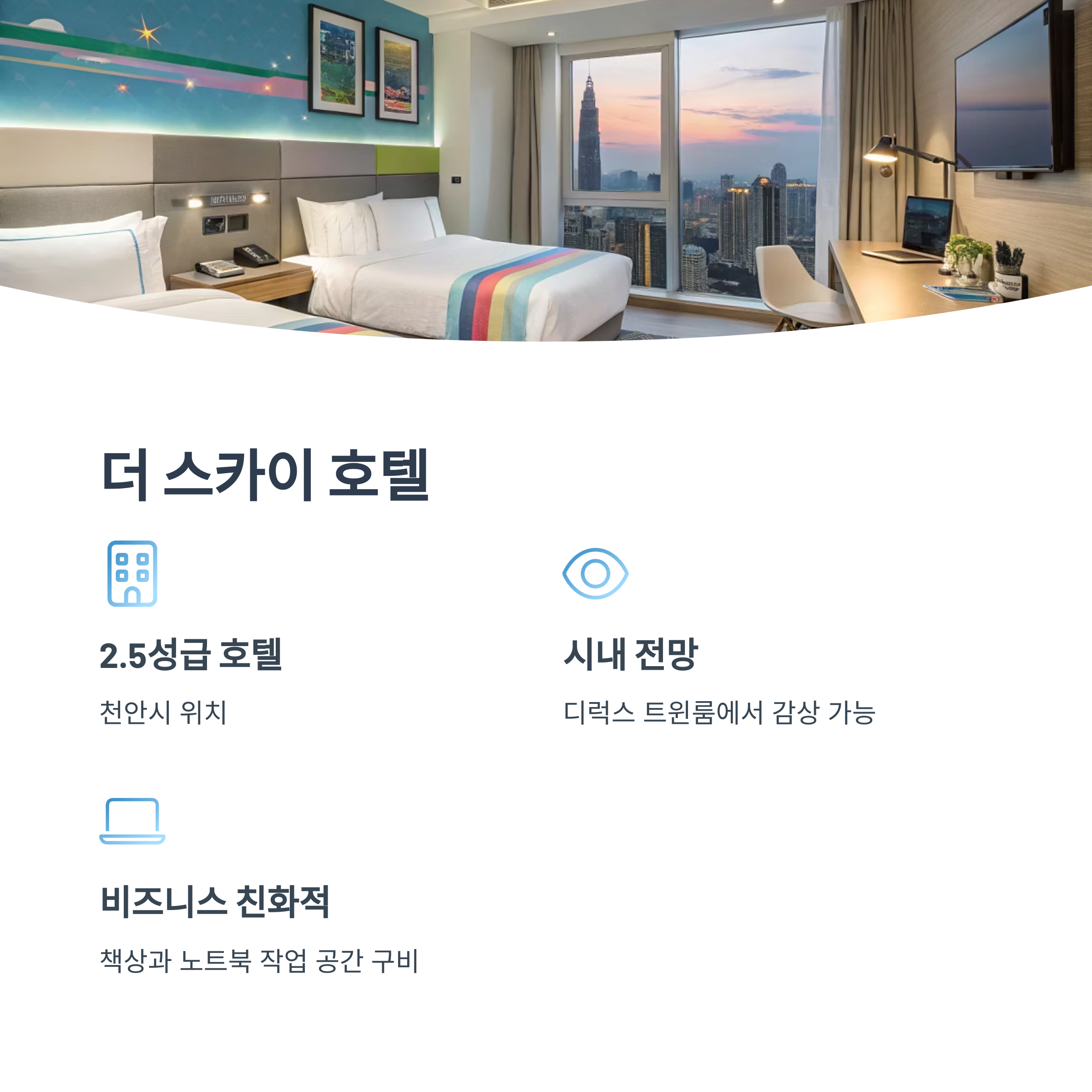 천안시에 위치한 2.5성급 호텔로, 디럭스 트윈룸에서 시내 전망을 감상할 수 있습니다. 객실에는 책상과 노트북 작업 공간이 마련되어 있어 비즈니스 여행객에게도 적합합니다.(Hotels.com)