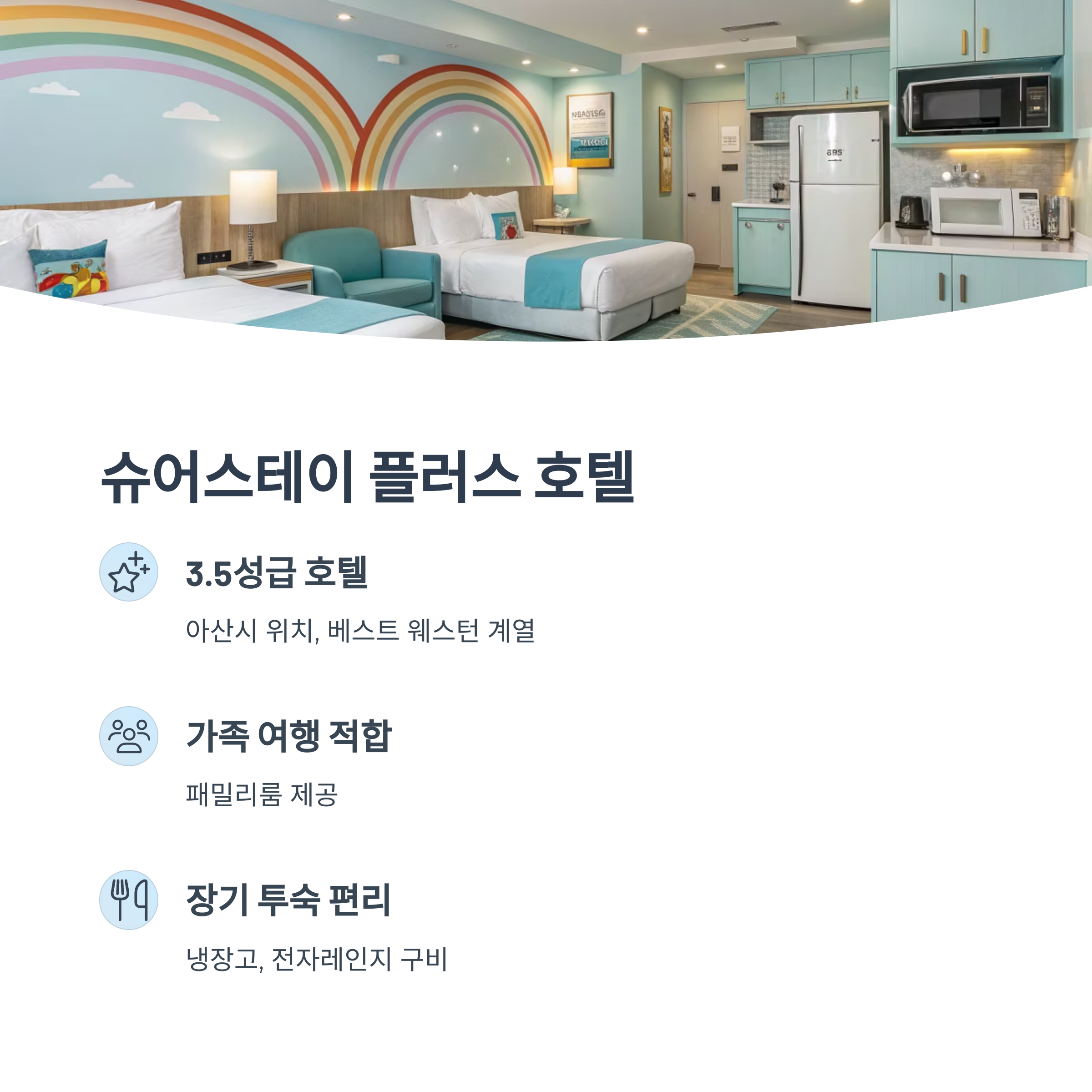 아산시에 위치한 3.5성급 호텔로, 가족 단위 여행객에게 적합한 패밀리룸을 제공합니다. 객실 내에는 냉장고와 전자레인지가 구비되어 있어 장기 투숙에도 편리합니다.(Hotels.com, Hotels.com)