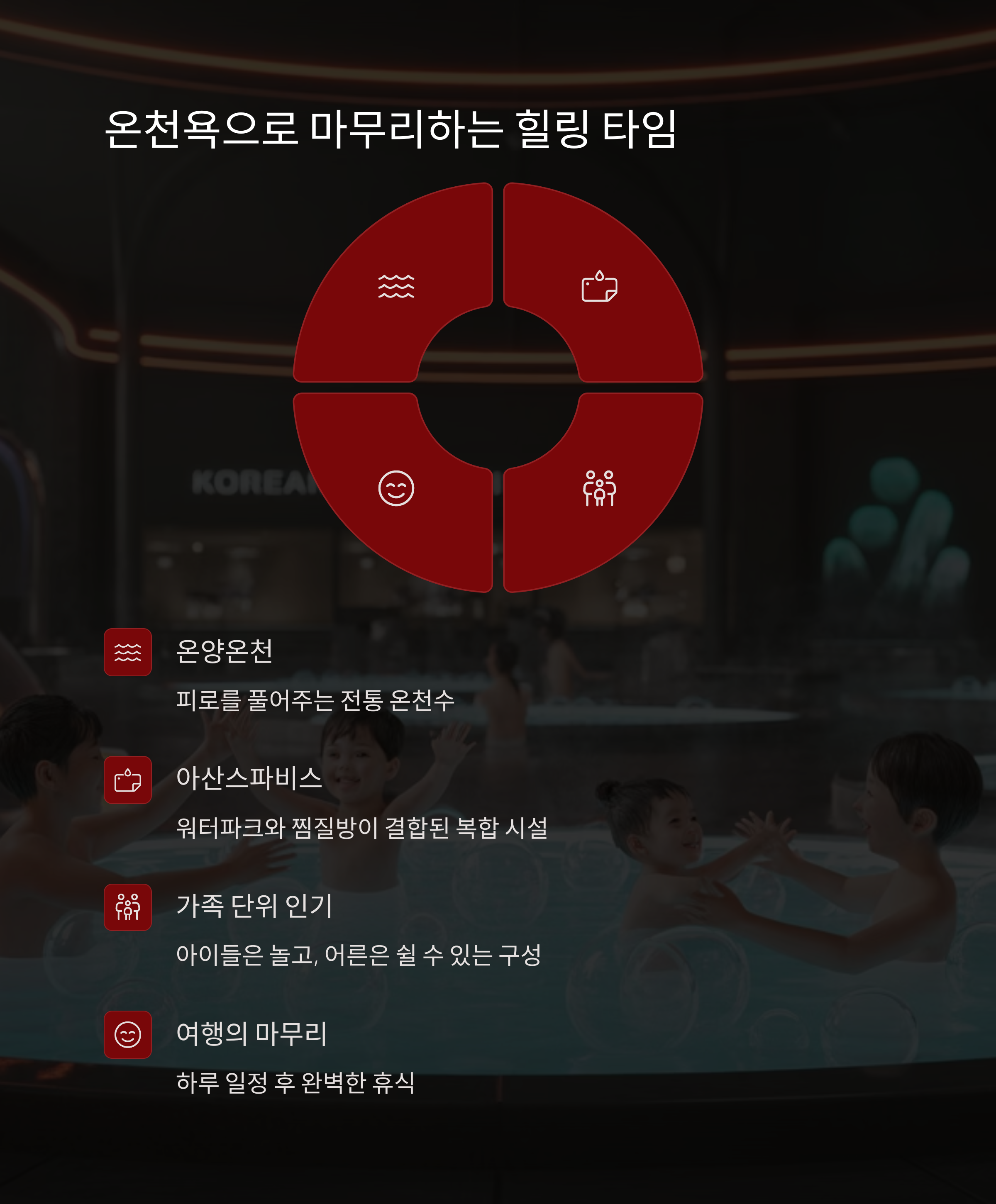 특히 가족 단위 여행객에게 인기 있는 아산스파비스는 워터파크와 찜질방이 결합된 형태로