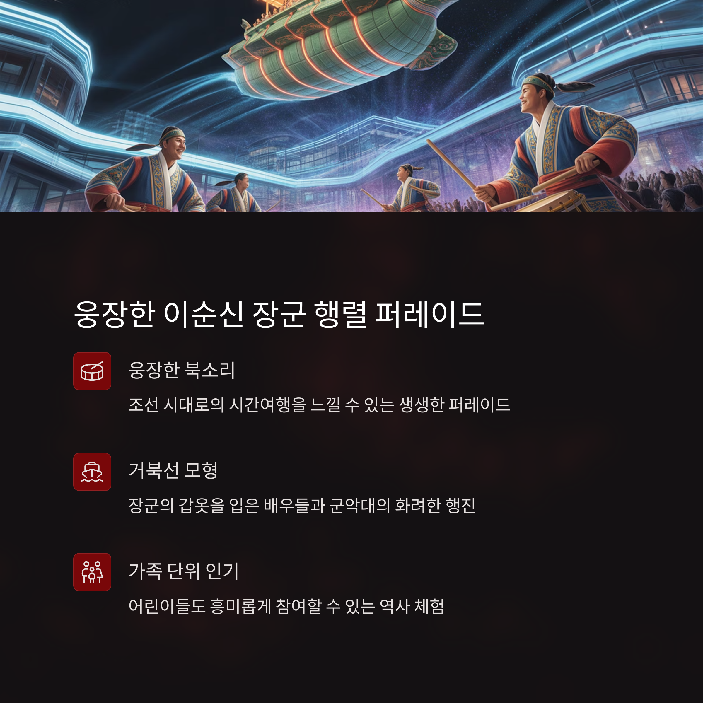 장군의 갑옷을 입은 배우들과 군악대, 거북선 모형이 함께 어우러져 마치 조선 시대로 시간여행을 떠난 느낌이었습니다.