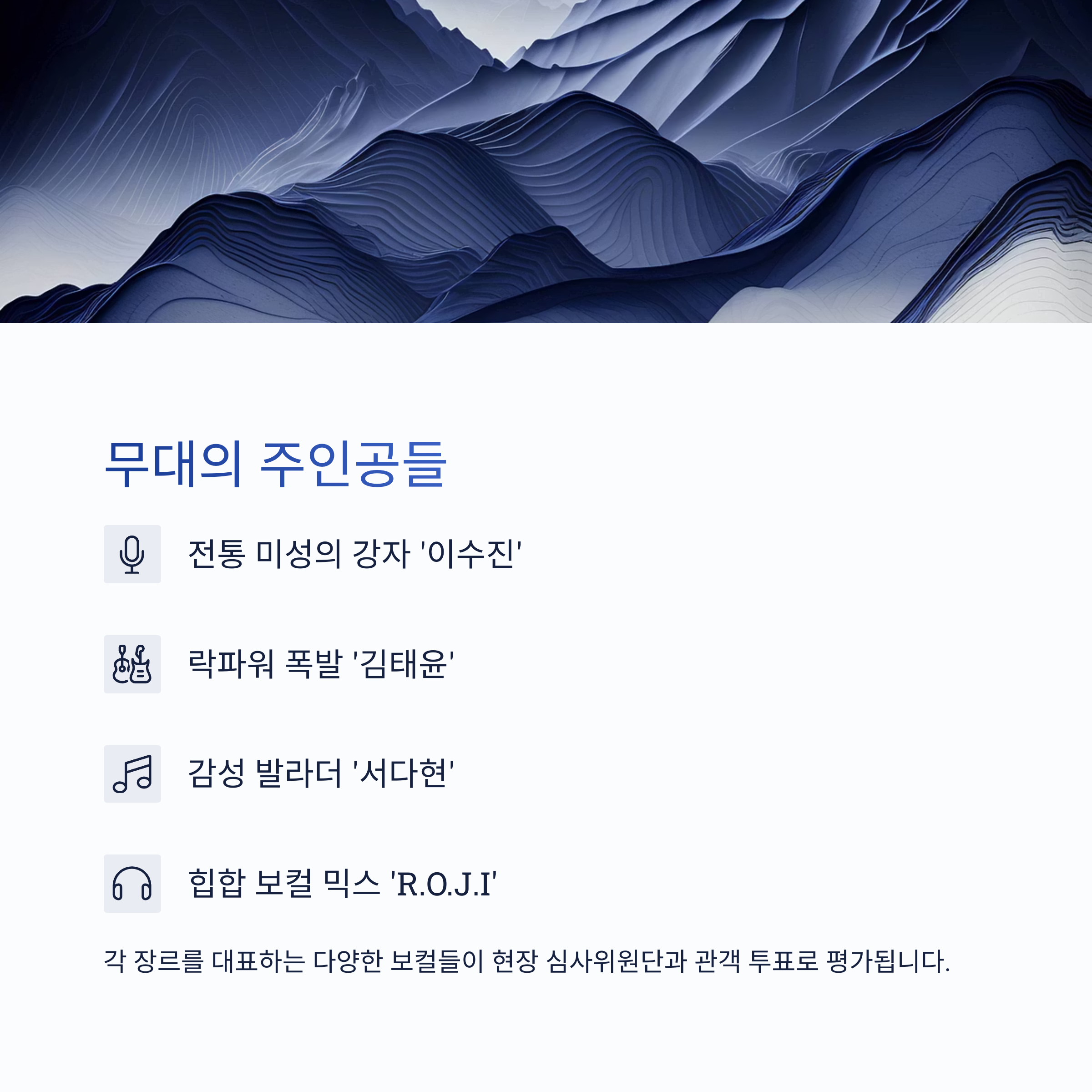 각 무대는 현장 심사위원단 + 관객 투표 점수로 평가됩니다.
