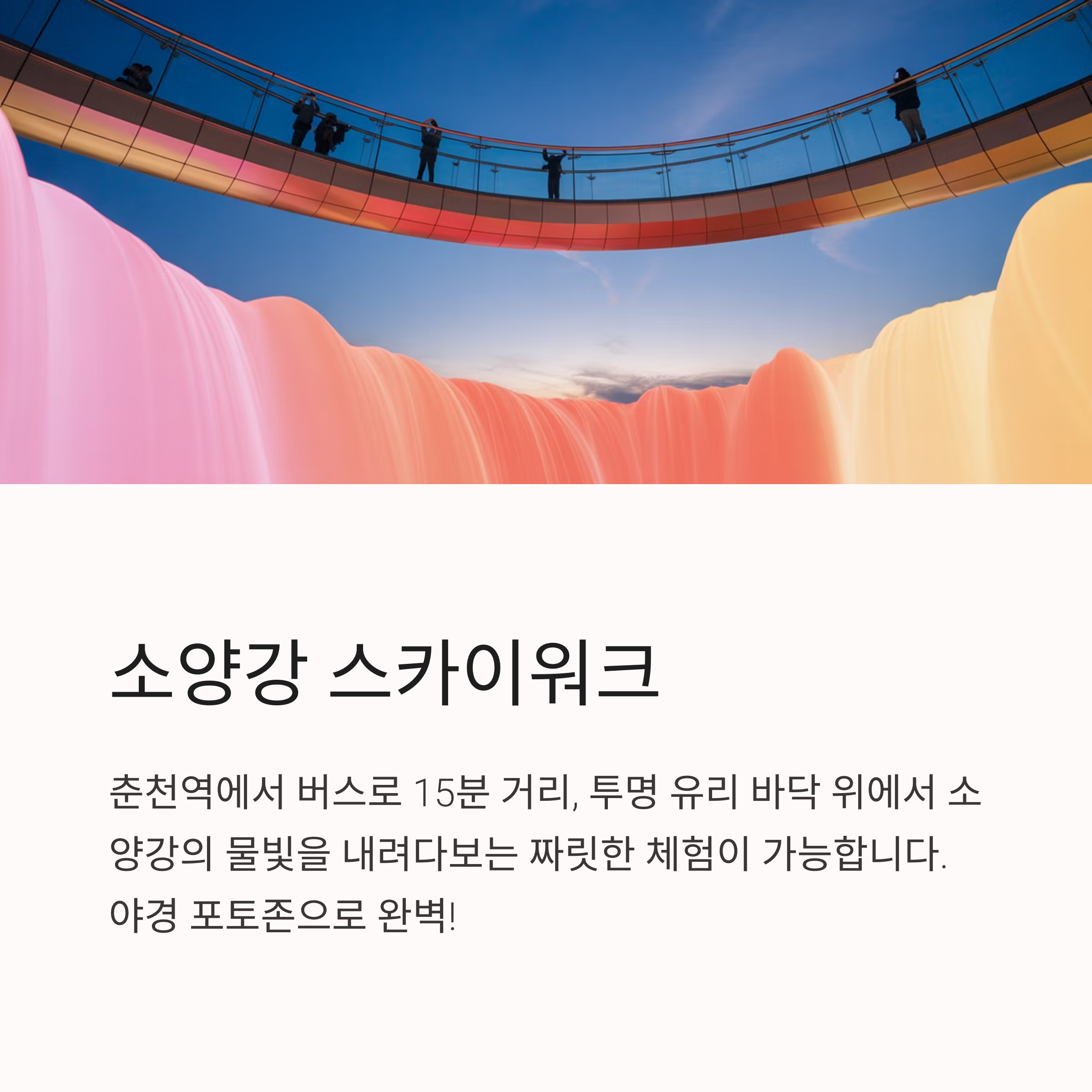 투명 유리 바닥 위에서 소양강의 물빛을 내려다보는 짜릿한 체험이 가능합니다.