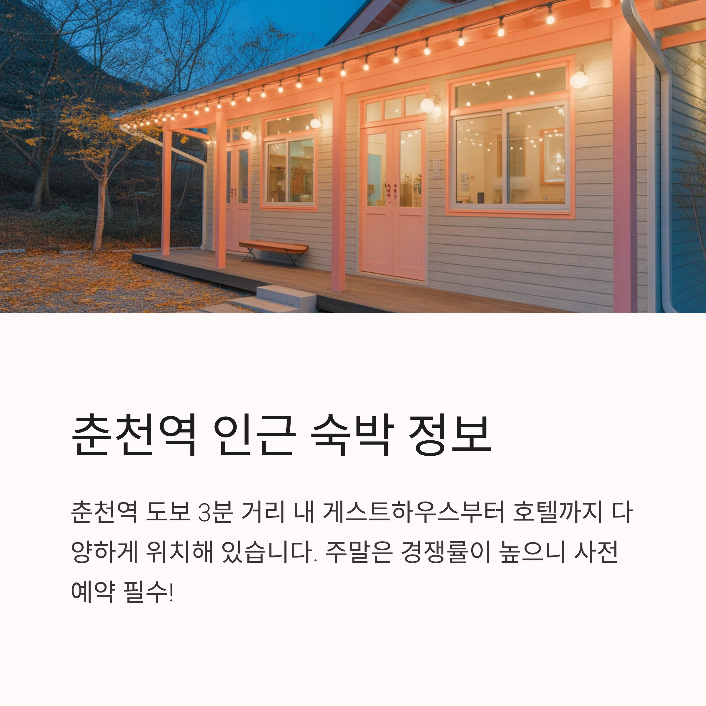 남춘천역 주변도 조용하고 편의시설이 가까워 숙박지로 인기가 높습니다.