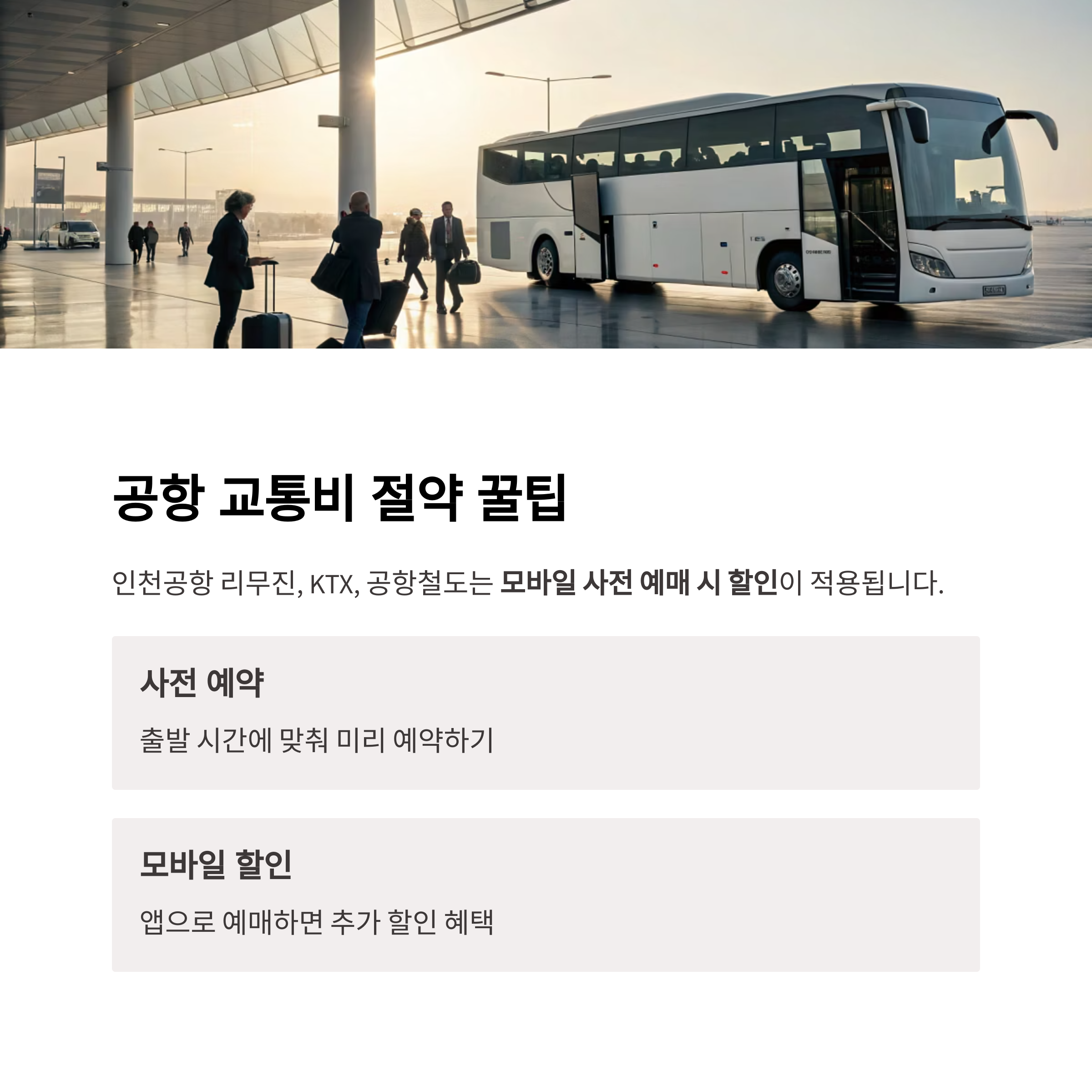 인천공항 리무진, KTX, 공항철도 등은 모바일 사전 예매 시 할인이 적용되는 경우가 많습니다.