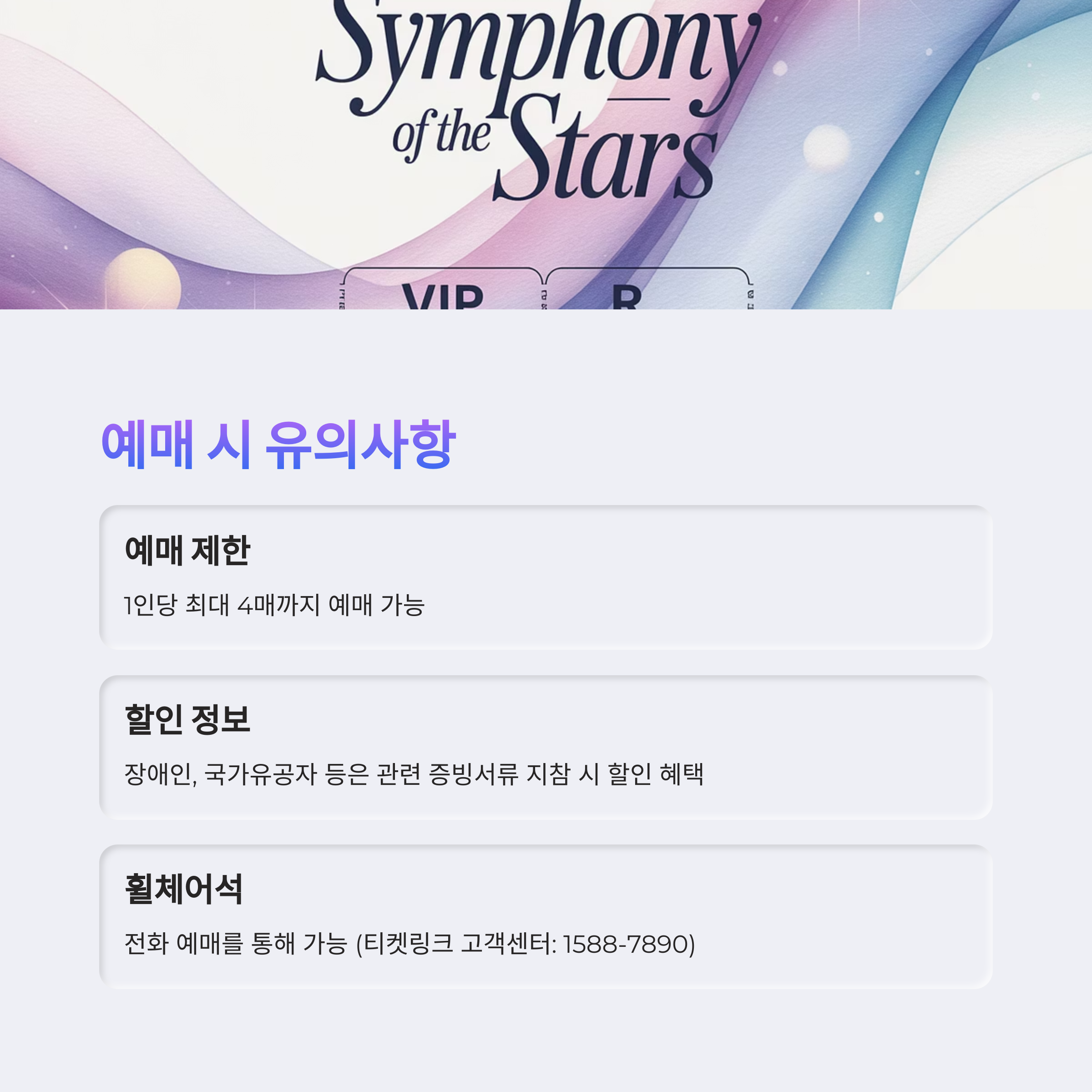 • 휠체어석 예매는 전화 예매를 통해 가능합니다. (티켓링크 고객센터: 1588-7890)