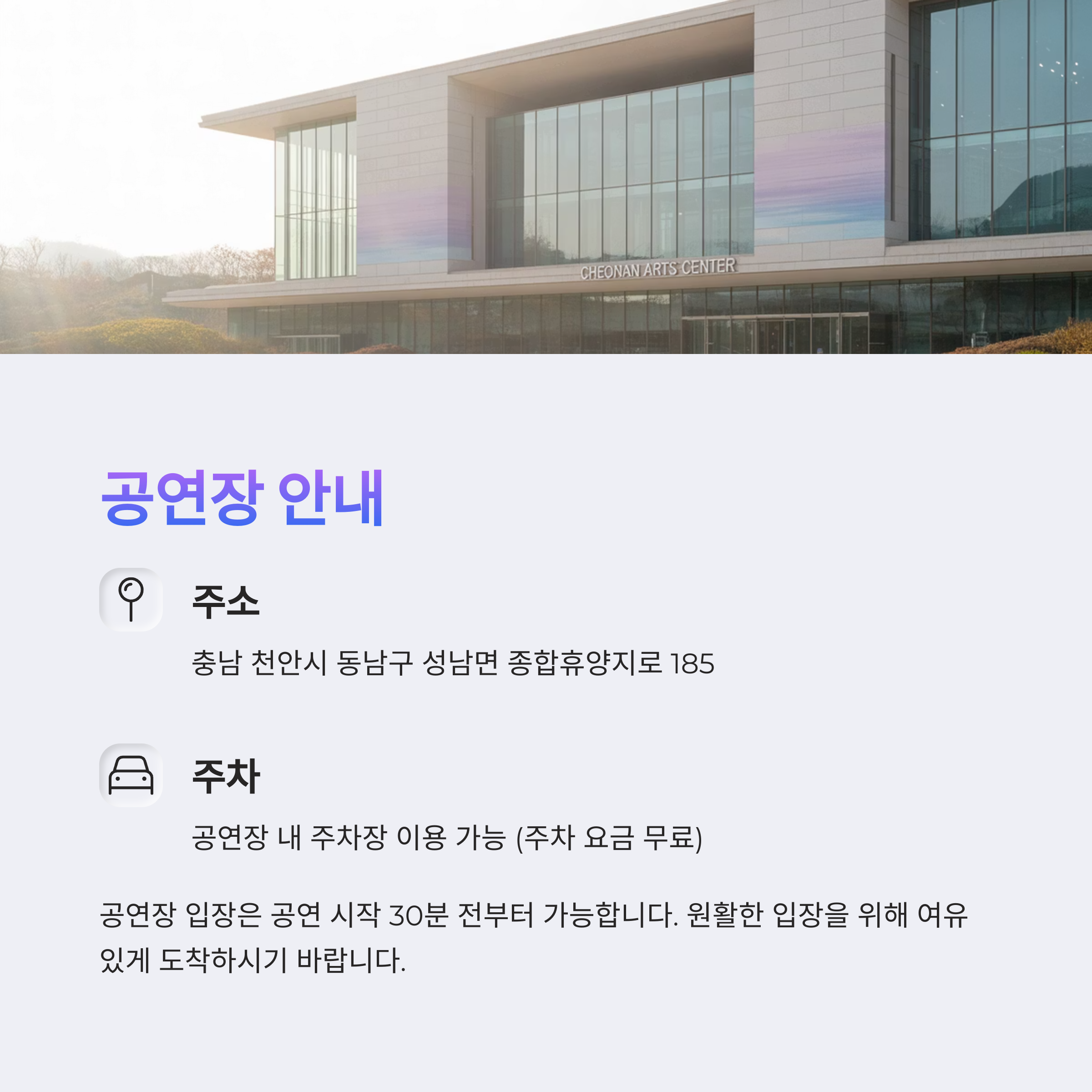 - 주차: 공연장 내 주차장 이용 가능 (주차 요금 무료)