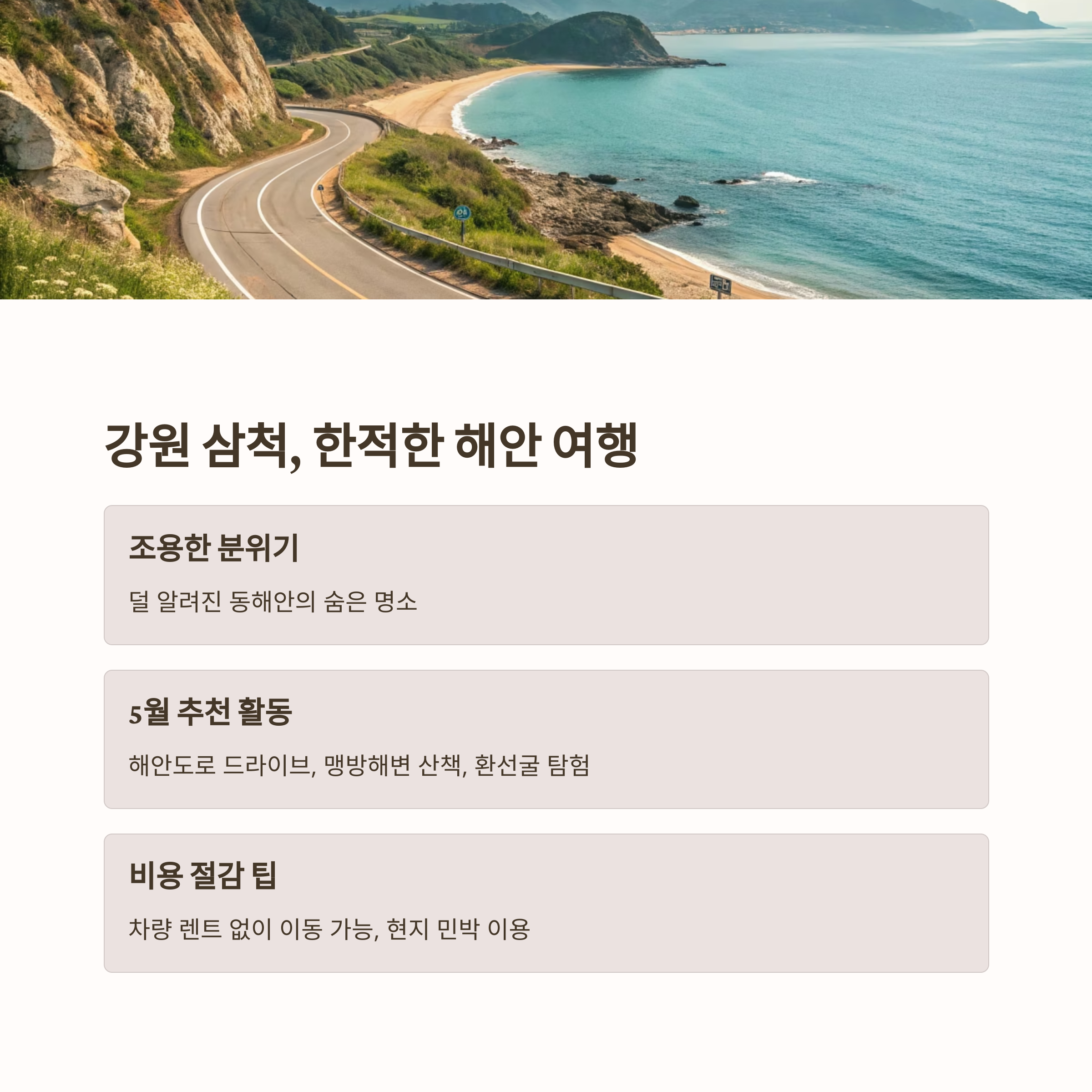 삼척은 동해안 중에서도 비교적 덜 알려져 있어 조용한 분위기 속 가성비 여행이 가능합니다.