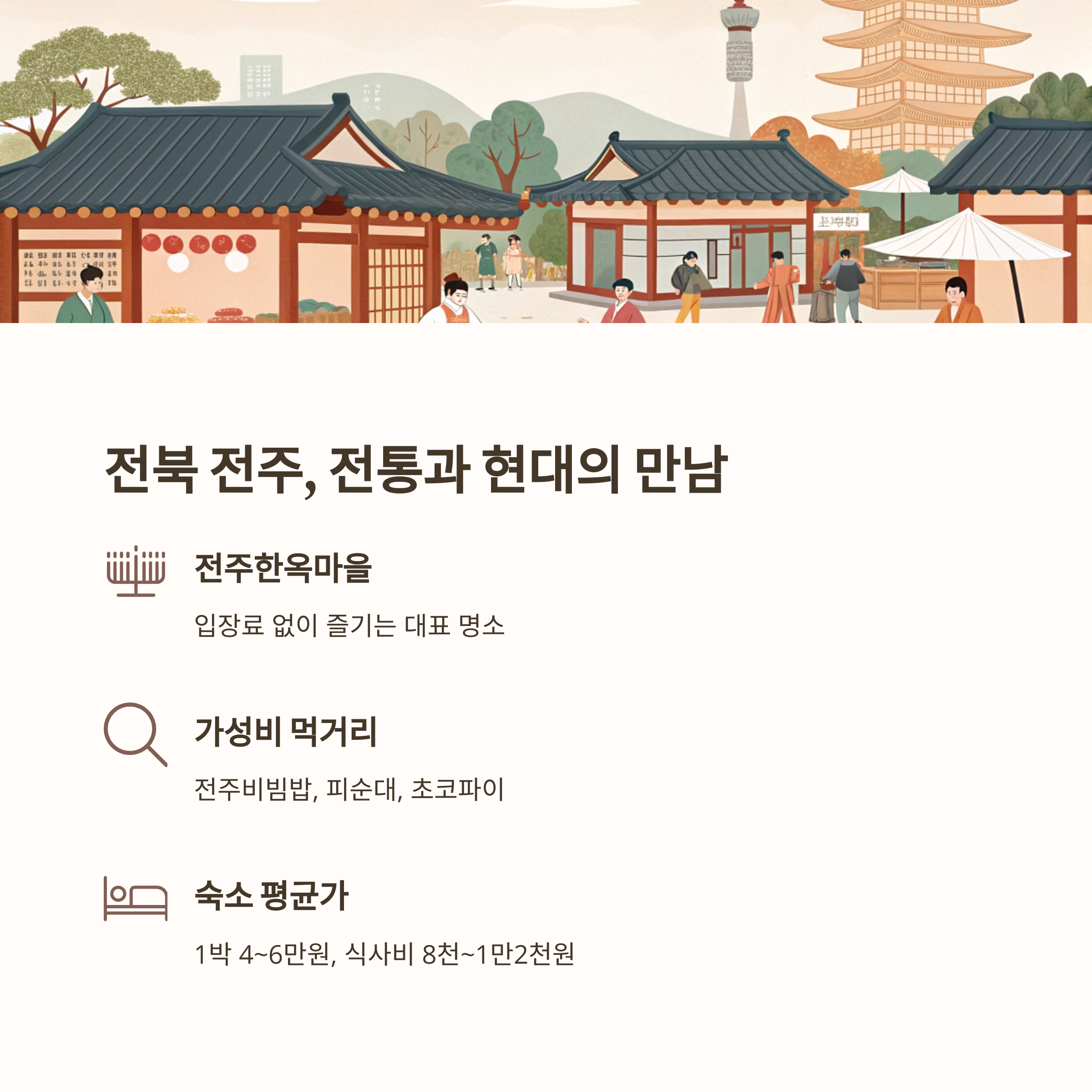 전주는 전통과 현대가 만나는 도시로, 전주한옥마을은 입장료 없이도 즐길 수 있는 대표 명소입니다.