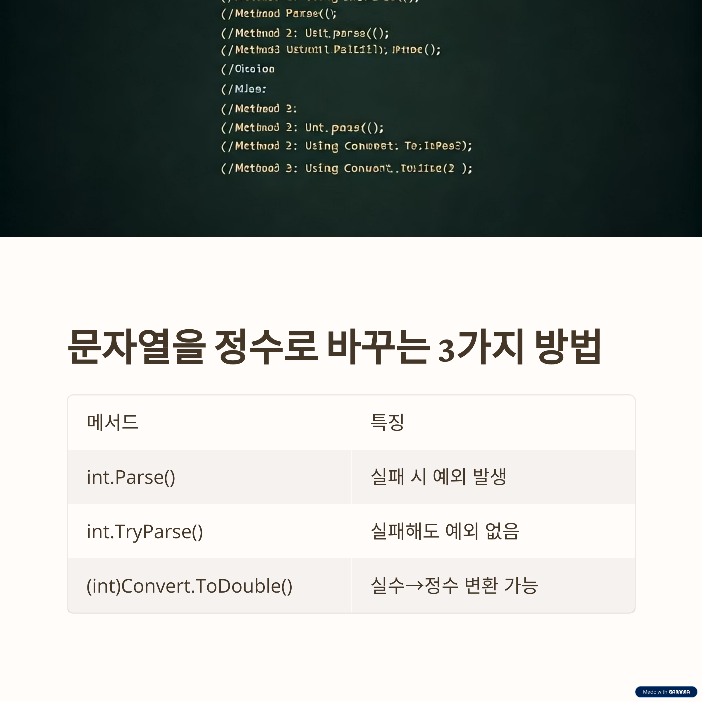 • TryParse()는 변환 실패 시 0으로 초기화되므로 디폴트 처리하기 좋습니다.