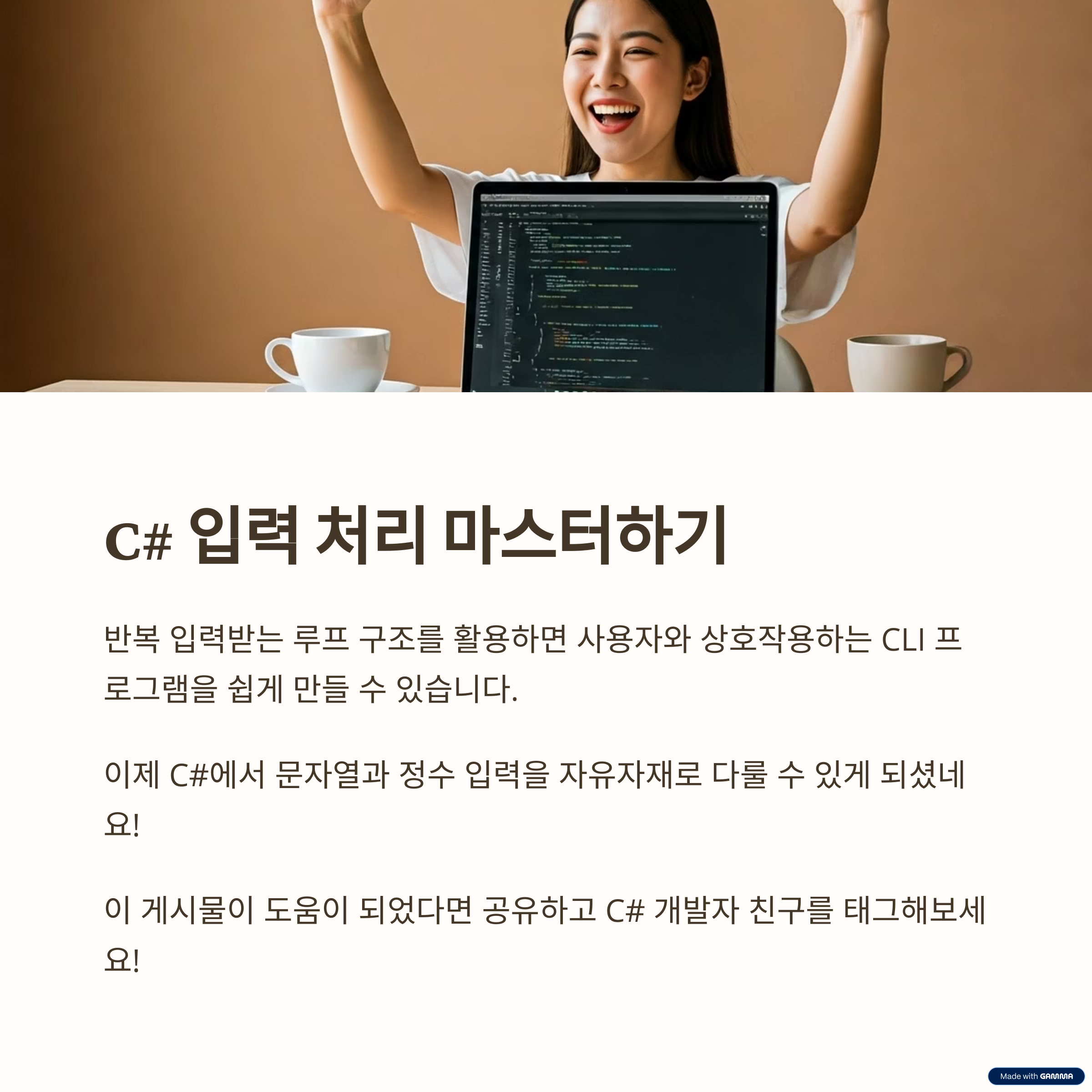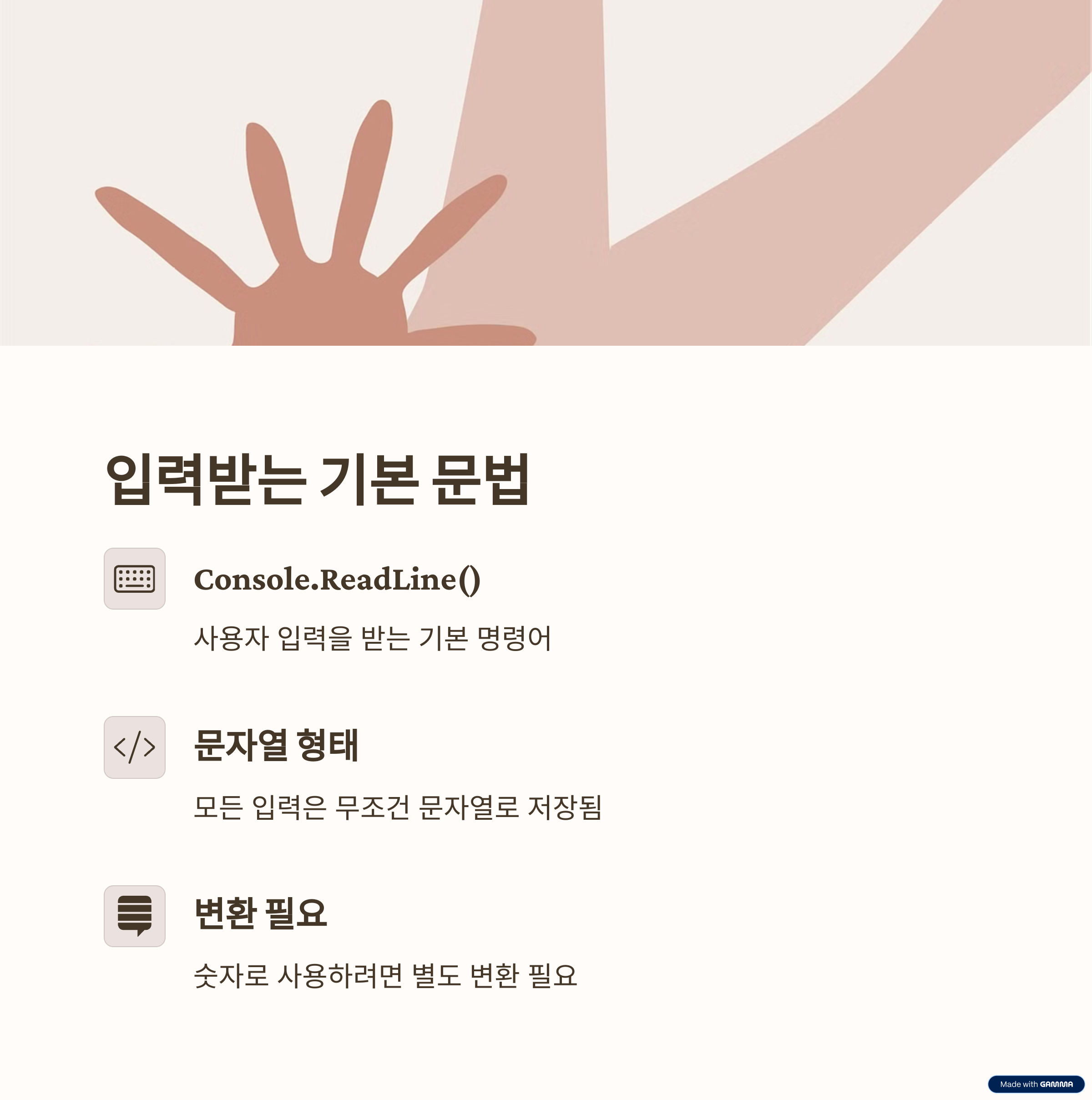 "콘솔 프로그램에서 사용자 입력을 받으려면 Console.ReadLine()을 사용합니다."