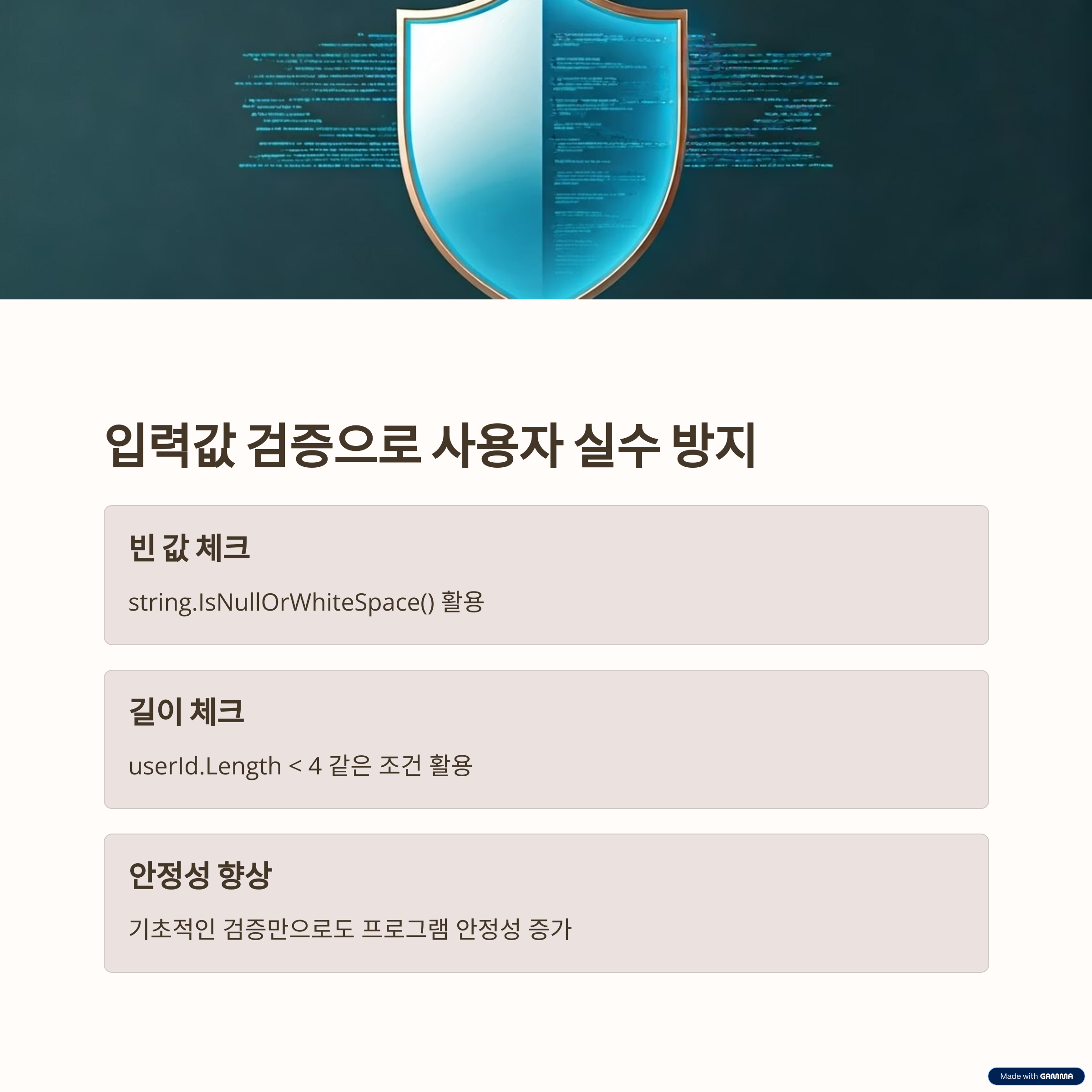 | 안전한 변환 | int.TryParse() | 실패해도 예외 없음 |