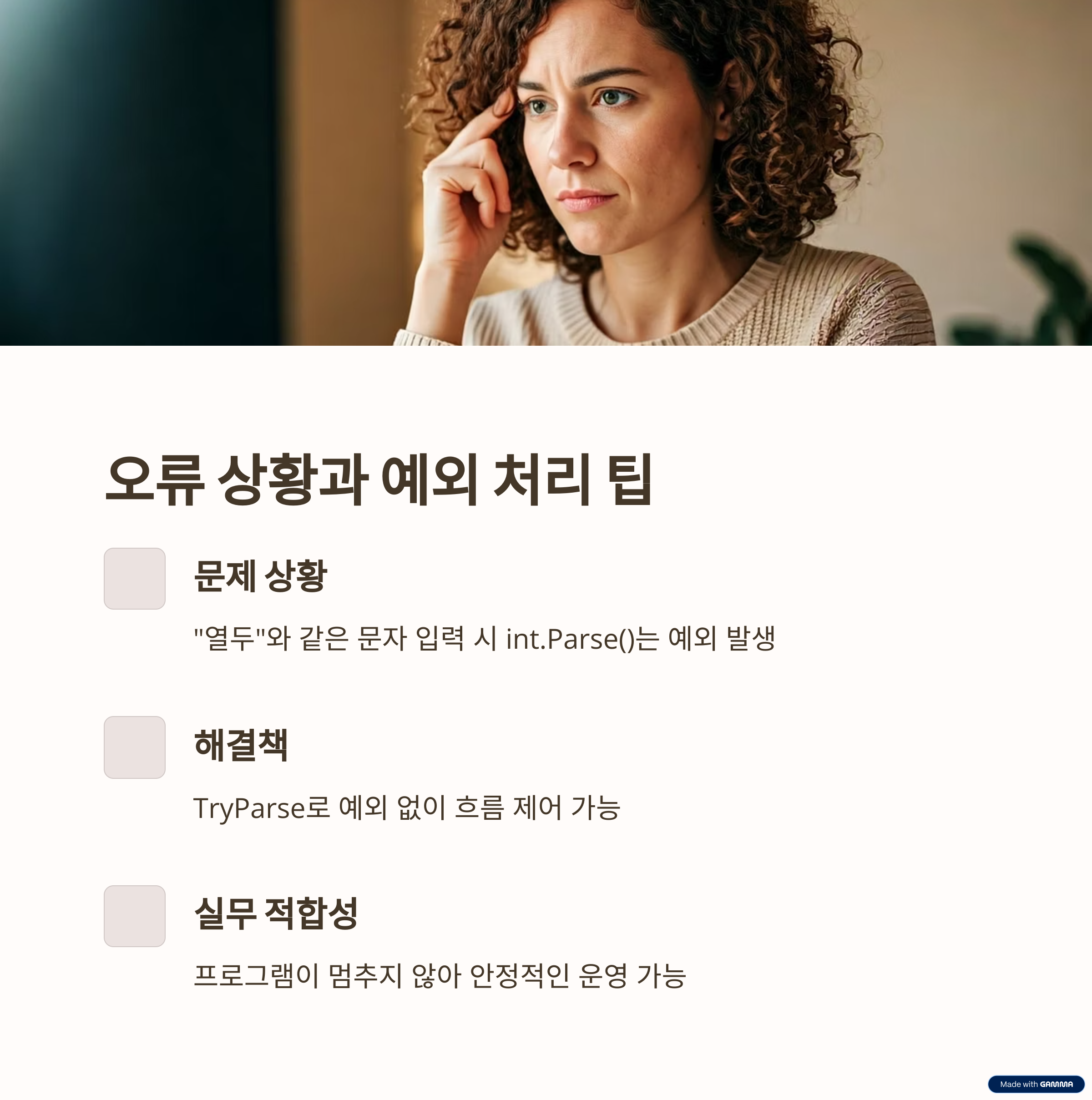 "TryParse를 쓰면 입력 오류에도 프로그램이 멈추지 않아서 실무에 적합합니다."