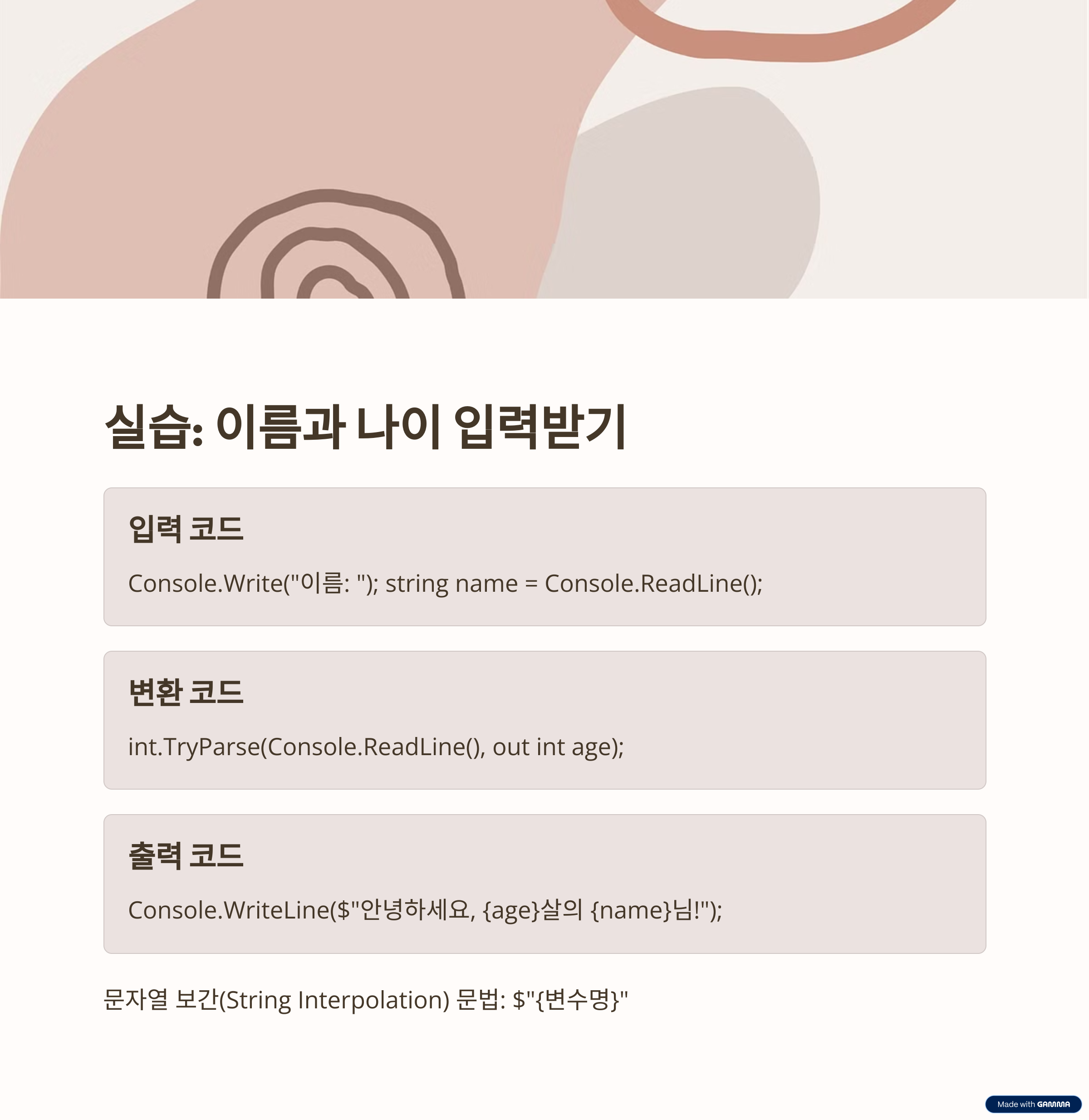 Console.WriteLine($"안녕하세요, {age}살의 {name}님!");
