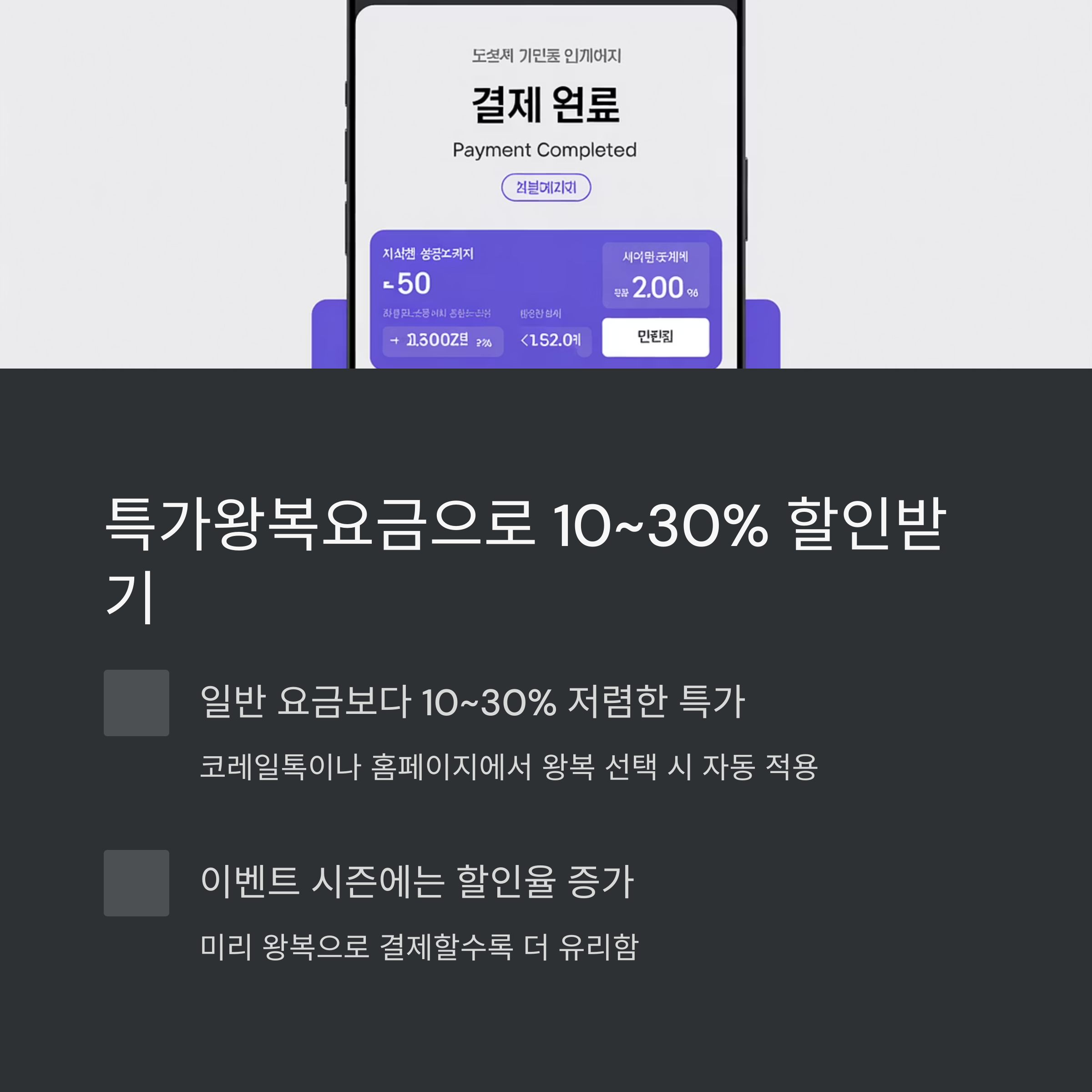 이 경우 왕복 예매 시 개별 구간보다 더 큰 할인을 받을 수 있으며, 앱 내 '이벤트' 탭에서 실시간 확인 가능합니다.