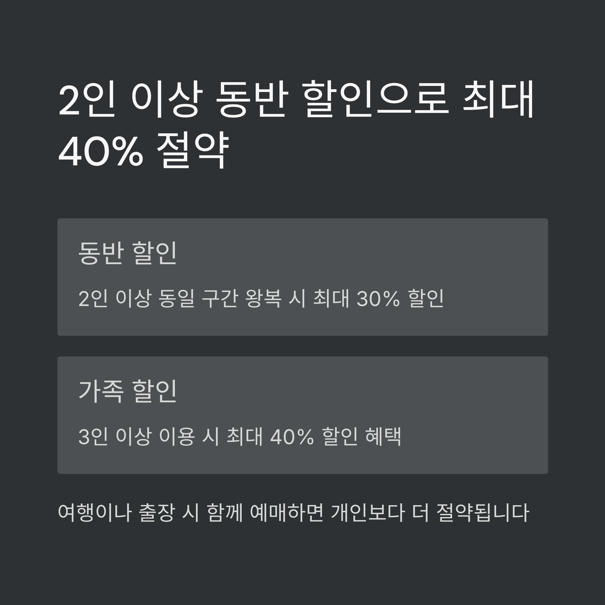 2명 이상이 동일 구간을 왕복으로 이용할 경우, 최대 30% 할인된 특가 요금이 적용됩니다.